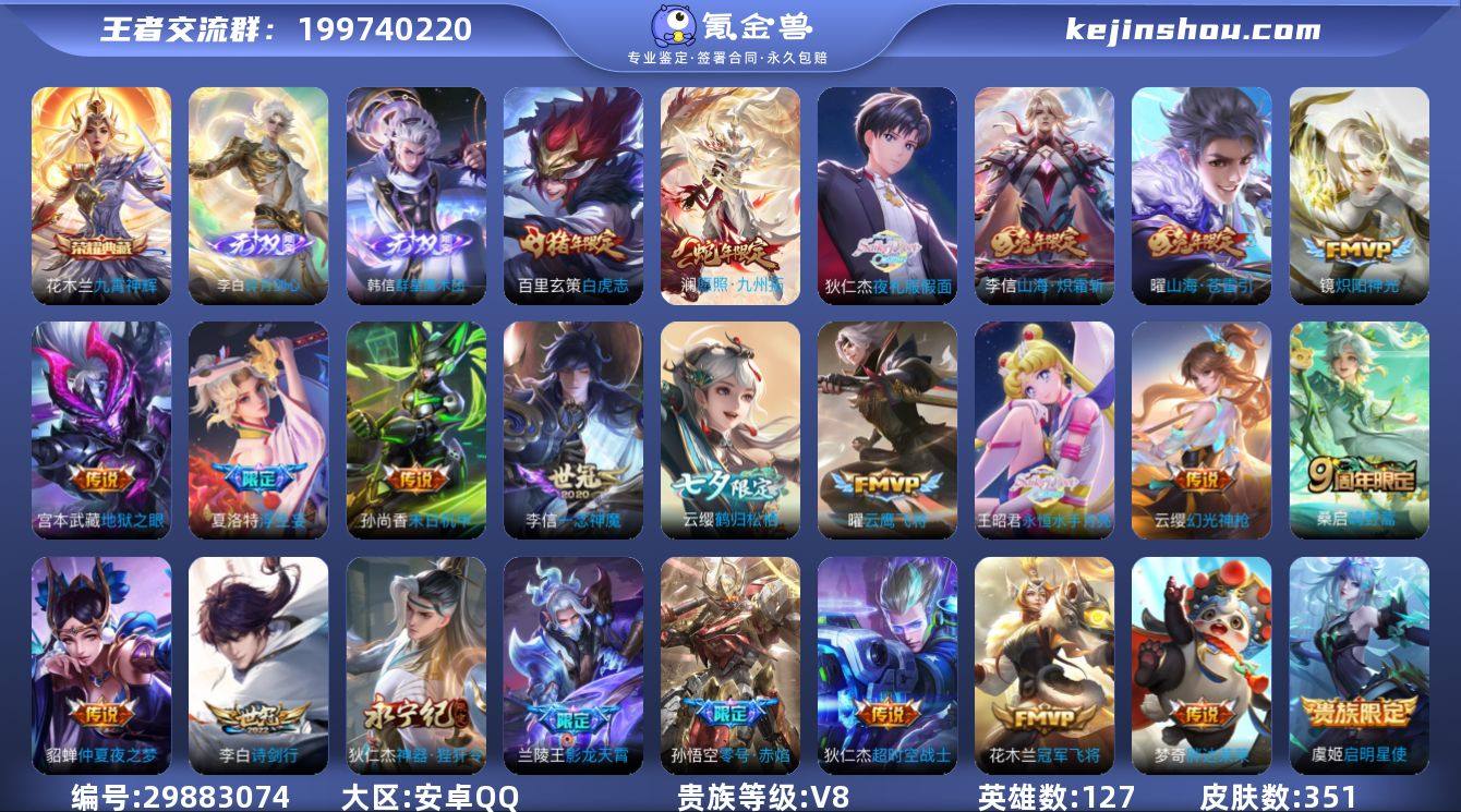 安卓Q-V8-荣耀黄金I段位-127英雄-351皮肤-1典藏-0珍品无双-2无双-0珍品传说-24传说-94史诗 【英雄全皮】:鬼谷子全皮,李信全皮,蒙恬全皮,赵怀真全皮,海诺全皮 【荣耀典藏】:花木兰九霄神辉 【无双皮肤】:李白碎月剑心,韩信群星魔术团 【传说皮肤】:澜愿照九州拓,云缨幻光神枪,桑启鸣野蒿,狄仁杰夜礼服假面,王昭君永恒水手月亮,兰陵王影龙天霄,云缨鹤归松栖,夏洛特浮生妄,曜山海苍雷引,李信山海炽霜斩,李白诗剑行,狄仁杰神器狴犴令,镜炽阳神光,虞姬启明星使,孙悟空零号赤焰,曜云鹰飞将,李信一念神魔,百里玄策白虎志,花木兰冠军飞将,梦奇胖达荣荣,貂蝉仲夏夜之梦,孙尚香末日机甲,宫本武藏地狱之眼,狄仁杰超时空战士 【限定皮肤】:暃埋骨钱,蒙犽顽岩魄,蔡文姬夏日便利店,大乔绒语心约,虞姬夏日便利店,姜子牙天穹之誓,杨戬破阵退雄兵,李白谪仙醉月,狄仁杰阴阳师,赵云皇家上将,赵云龙胆,墨子神迹守卫,嬴政优雅恋人,孙尚香蔷薇恋人,鲁班七号狮舞东方,鲁班七号乒乒小将,庄周高山流水,芈月白晶晶,芈月幻夜卜梦,吕布御风骁将,元歌云间偶戏,元歌无心,夏侯惇朔风刀,甄姬幽恒,典韦蓝屏警告,马可波罗山海玄木吟,狄仁杰魔术师,狄仁杰万华元夜,狄仁杰神器狴犴令,达摩星际陆战队,达摩沙漠行僧,项羽海滩派对,老夫子醍醐杖,老夫子航海奇遇记,程咬金演武夺筹,韩信傲雪梅枪,兰陵王影龙天霄,兰陵王金庭之子,亚瑟潮玩骑士王,孙悟空至尊宝,孙悟空零号赤焰,孙悟空孙行者,牛魔御旌,后羿辉光之辰,后羿圣弓游侠,刘备百相守梦,李元芳云中旅人,虞姬启明星使,钟馗神迹守卫,钟馗驱傩正仪,女娲朔望之晖,干将莫邪真爱魔法,鬼谷子原初探秘者,鬼谷子五谷丰年,黄忠火炮绅士,苏烈千军破阵,百里玄策白虎志,弈星混沌棋,沈梦溪大漠名商,明世隐疑决卦,裴擒虎...