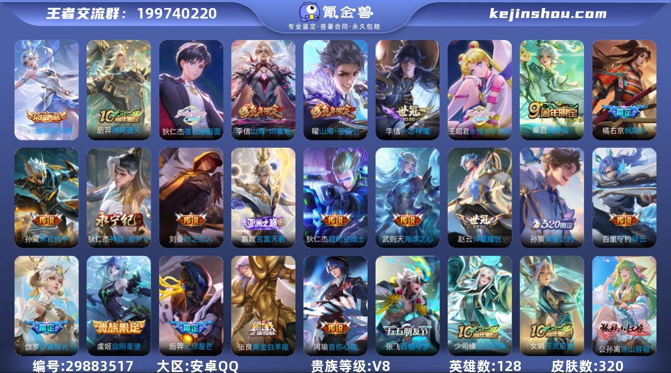 贵族等级:V8 典藏皮肤数:1 珍品无双皮肤数:0 无双皮肤数:0 珍品传说皮肤数:0 传说皮肤数:23 史诗皮肤数:111 皮肤数:320 英雄数:128 段位:荣耀王者