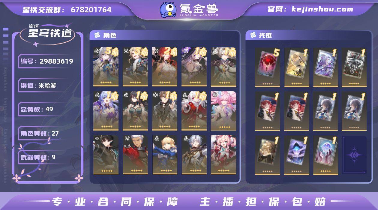 开拓等级:70 开拓者性别:女 总黄数:49 星轨专票:0 五星角色数:27 3命布洛妮娅,3命彦卿,2命姬子,1命大黑塔,1命流萤,1命知更鸟,1命阮•梅,1命瓦尔特,1命克拉拉,0命昔涟,0命丹恒·腾荒,0命Archer,0命Saber,0命白厄,0命风堇,0命遐蝶,0命缇宝,0命阿格莱雅,0命星期日,0命飞霄,0命翡翠,0命砂金,0命黄泉,0命真理医生,0命藿藿,0命杰帕德,0命白露 五星光锥数:9 5精记一位星神的陨落,1精没有回报的加冕,1精让告别,更美一些,1精行于流逝的岸,1精银河铁道之夜,1精但战斗还未结束,1精如泥酣眠,1精记忆的质料,1精记忆永不落幕 邮箱状态:未绑定 卖家说:可小刀,急出