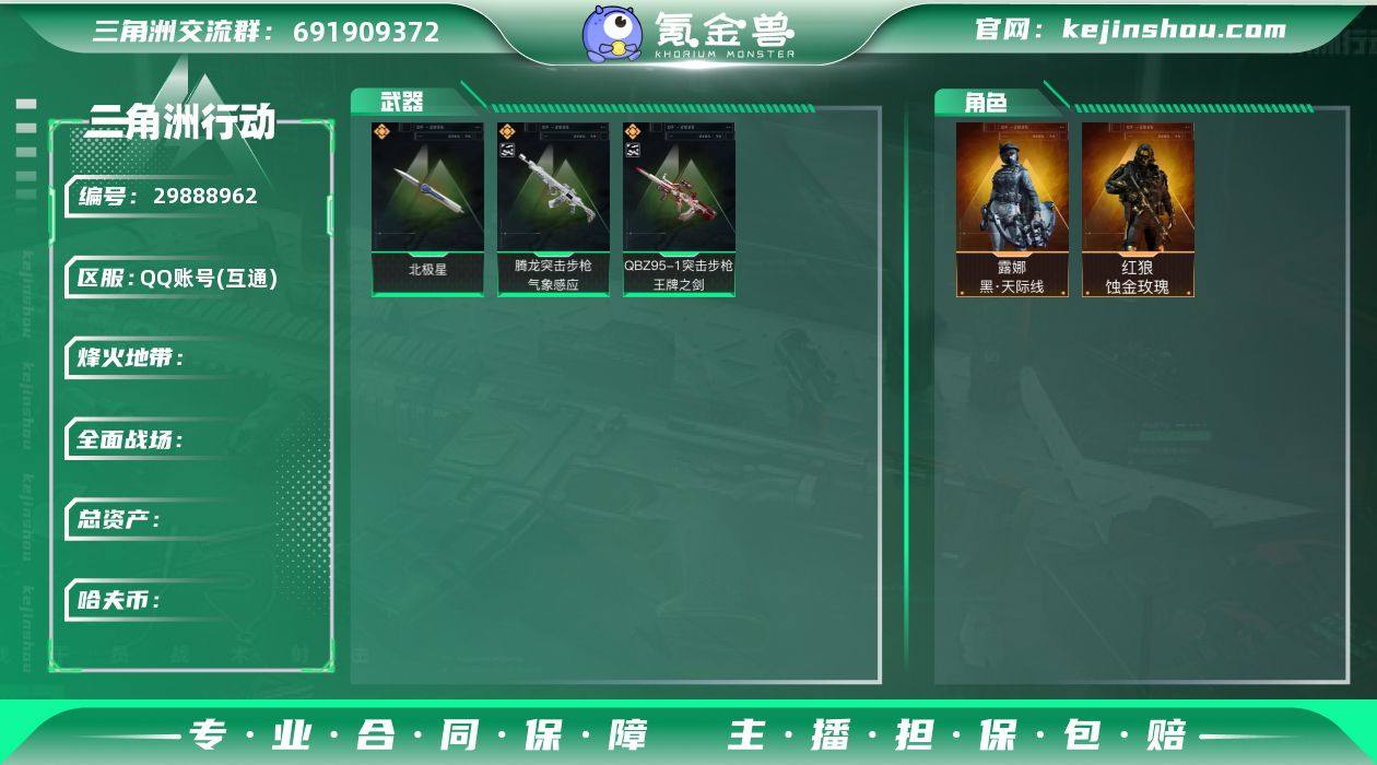 ABC10688/QQ区/可二次/钱包注销/【总资产:379.7M+QBZ95-1突击步枪-王牌之剑(优品S)+腾龙突击步枪-气象感应(优品B)+近战北极星+红狼蚀金玫瑰+露娜黑天际线+】哈夫币:12761W,武器皮肤170;烽火60级:钻石Ⅲ,战场:军士长Ⅳ,【安全箱】基础安全箱;【特勤处等级】仓库LV.8,靶场LV.7,训练中心LV.7;【捆绑包7】北极星捆绑包,鹅鸭杀捆绑包,蚀金玫瑰捆绑包,黑天际线捆绑包,特斯拉线圈捆绑包,捞点薯条捆绑包,蝮蛇捆绑包;【干员皮肤4】红狼蚀金玫瑰,露娜黑天际线,蜂医送葬人无题密令,深蓝不破誓约;【典藏皮肤】QBZ95-1突击步枪-王牌之剑(优品S),腾龙突击步枪-气象感应(优品B);【近战皮肤】近战武器-北极星,近战武器-黑鹰;【步枪皮肤】QBZ95-1突击步枪-王牌之剑,腾龙突击步枪-气象感应,M4A1突击步枪-阿米娅,M4A1突击步枪-蚀金玫瑰,ASh-12战斗步枪-鹅鸭杀,AK-12突击步枪-特斯拉线圈,SCAR-H战斗步枪-启航,G3战斗步枪-骑士,CAR-15突击步枪-阿米娅,腾龙突击步枪-捞点薯条,K437突击步枪-北极星,AK-12突击步枪-原型机,QBZ95-1突击步枪-曙光,ASh-12战斗步枪-无极限,M16A4突击步枪-竞赛选手,AUG突击步枪-蝮蛇,SCAR-H战斗步枪-囚徒,ASVal突击步枪-典狱官,腾龙突击步枪-无垢,腾龙突击步枪-猎鳄行动,K437突击步枪-守护者;【冲锋枪皮肤】UZI冲锋枪-特斯拉线圈,SR-3M紧凑突击步枪-特斯拉线圈,勇士冲锋枪-能天使-午夜邮差,QCQ171冲锋枪-北极星,QCQ171冲锋枪-鹅鸭杀,MP5冲锋枪-战术竞备,P90冲锋枪-紧急戒备,SR-3M紧凑突击步枪-荒野求生,SR-3M紧凑突击步枪-战术竞备,MP7冲锋枪-无垢,MP7冲锋枪-守护者;【射手步枪皮肤】Mini-14射手步枪-守护者,SVD狙击步枪-阿萨拉工艺,SVD狙击步枪-荒野求生,PSG-1射手步枪-无垢;【狙击步枪皮肤】AWM狙击步枪-捞点薯条,SV-98狙击步枪-林中...