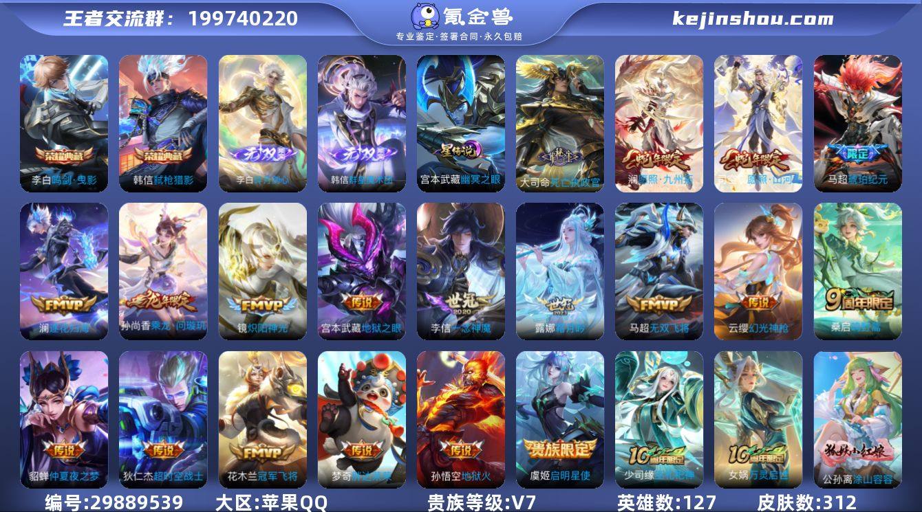 贵族等级:V7 典藏皮肤数:2 珍品无双皮肤数:0 无双皮肤数:2 珍品传说皮肤数:0 传说皮肤数:19 史诗皮肤数:87 皮肤数:312 英雄数:127 段位:至圣王者 卖家说:个性按键挺多的,万战李白澜 带妹号