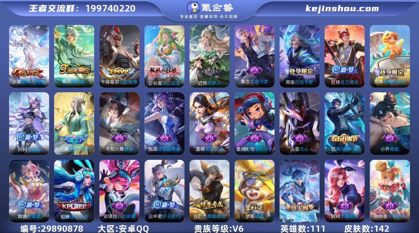 实名: 不可修改 性别: 男号 贵族等级: V6 英雄数: 111 皮肤数: 142 传说皮: 久胜战神,神树通天 限定皮: 逐梦之音,鸣野蒿,逐霄战戟,愿照·千秋盛 亮点: 【精品号手慢无】贵族V6,夺宝186,满级铭文,练手小号,5传说,久胜战神,神树通天,逐梦之音,鸣野蒿,逐霄战戟,愿照·千秋盛.