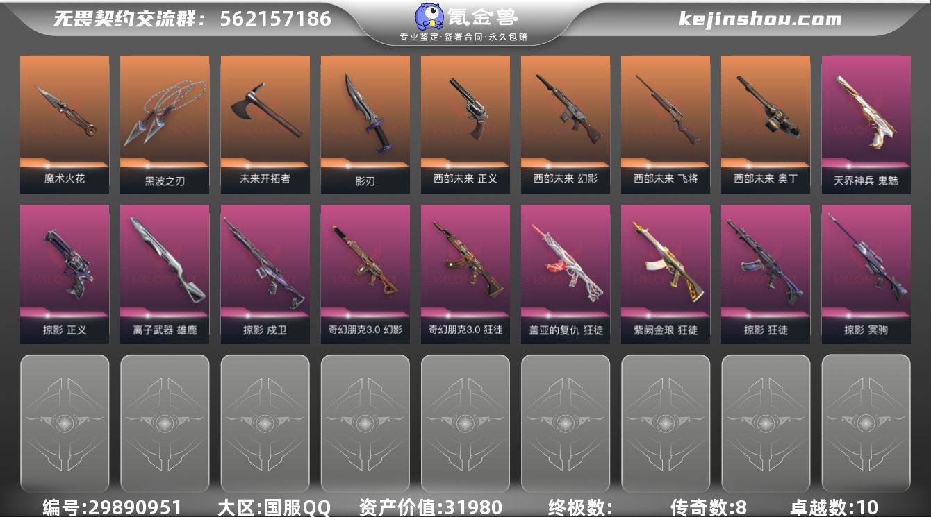 8橙皮 10紫皮 31皮肤 28英雄 70卡面 670已用源晶 铂金段位 【套装】:掠影套装,西部未来 【近战武器皮肤】:影刃,未来开拓者,魔术火花,黑波之刃 【佩枪皮肤】:正义-掠影,正义-西部未来,鬼魅-天界神兵 【霰弹枪皮肤】:雄鹿-离子武器 【步枪皮肤】:幻影-西部未来,狂徒-掠影,戍卫-掠影,奇幻朋克3.0狂徒,幻影-奇幻朋克3.0,狂徒-紫阙金琅,狂徒-盖亚的复仇 【狙击枪皮肤】:冥驹-掠影,飞将-西部未来 【机枪皮肤】:奥丁-西部未来 【挂饰】:西部未来挂饰,袖珍捷风挂饰,双城之战小蛋糕挂饰,神中神挂饰,冬日絮语挂饰,幸运中国结挂饰,终章KO小金人挂饰