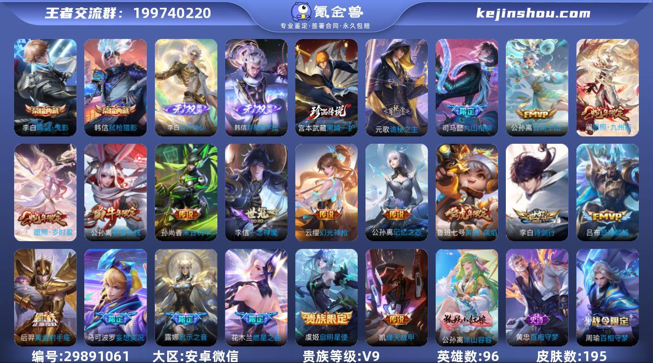 贵族等级:V9 典藏皮肤数:2 珍品无双皮肤数:0 无双皮肤数:2 珍品传说皮肤数:1 传说皮肤数:19 史诗皮肤数:63 皮肤数:195 英雄数:96 段位:星耀 卖家说:小国李白 公孙离金 还有忘了