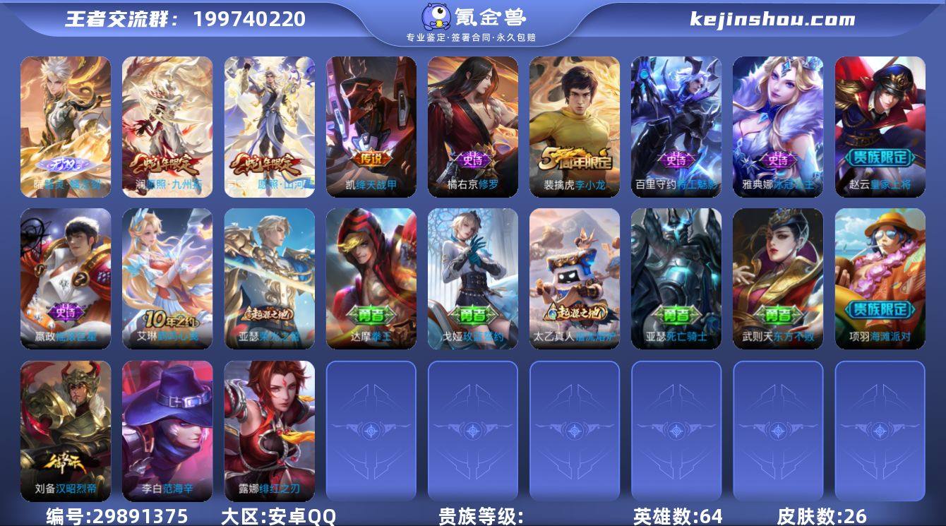 【王者荣耀】珍品无双0 典藏0 无双1 珍品传说0 传说4 史诗6 英雄64 皮肤26 贵族0级 无双皮肤:器灵·螭龙剑__传说皮肤:绛天战甲|愿照·山河定|愿照·九州拓|神树通天__稀有限定:李小龙|海滩派对|皇家上将|沙漠行僧|冰冠公主|摇滚巨星|修罗|特工魅影|谧流熔炉|荣光之誓|鹤鸣心笺__优质皮肤:绯红之刃|范海辛|死亡骑士|宫本武藏-未来纪元|东方不败|拳王|孙悟空-西部大镖客|汉昭烈帝|曜-归虚梦演|玫蓝誓约__贵族等级:无贵族等级__王者段位:永恒钻石【精品小号】器灵·螭龙剑,愿照·山河定,绛天战甲,愿照·九州拓