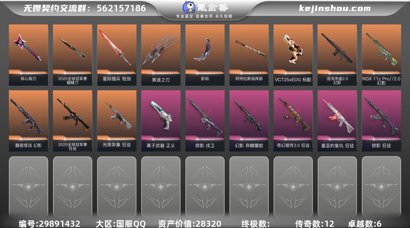 12橙皮 6紫皮 53皮肤 23英雄 56卡面 570已用源晶 铂金段位 【套装】:2025全球冠军赛 【近战武器皮肤】:阿特拉斯指挥部,碎心裂刃,星际猎兵 短剑,影钩,2025全球冠军赛 蝴蝶刀,黑波之刃 【佩枪皮肤】:标配-VCT25xEDG,正义-离子武器 【步枪皮肤】:幻影-异鳞魔蛇,幻影-RGX 11z Pro//2.0,幻影-黯夜怪谈,狂徒-掠影,戍卫-掠影,狂徒-光荣异象,幻影-混沌序曲2.0,2025全球冠军赛 狂徒,奇幻朋克3.0狂徒,狂徒-盖亚的复仇 【挂饰】:2025全球冠军赛挂饰,VCTxEDG挂饰