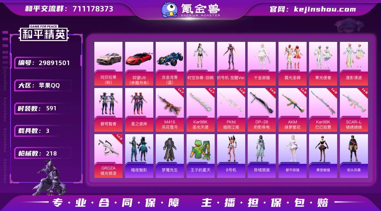 【特价出售】苹果Q-3载具8粉装8特效枪9热门153套装218枪皮 70093热力值 12印记 历史传奇王牌13星 【3载具】 仰望U9(赤霞丹朱) 玛莎拉蒂粉色 合金龙骨蓝色 【8粉装】 觉醒初号机 时空协奏·回响 千金淑猫 莲影清波 碧穹智者 霞光圣骑 星之彼岸 寒光使者 【8特效枪】 SCAR-L-锦绣绵绵 (5级) AKM-绿萝繁花 (5级) Kar98K-巳巳如意 (5级) DP-28-豹影疾电 (5级) PKM-江南烟雨 (6级) GROZA-镜光银凌 (5级) Kar98K-圣光天使 (7级) M416-风花雪月 (7级) 【9热门】 8号机 Mark.06 龟仙人 雪山精英 梦魇先生 SS1特训 蓝甜马卡龙 破蛋小黄鸡 黑色刀锋 【1背包】 水曜玄武背包