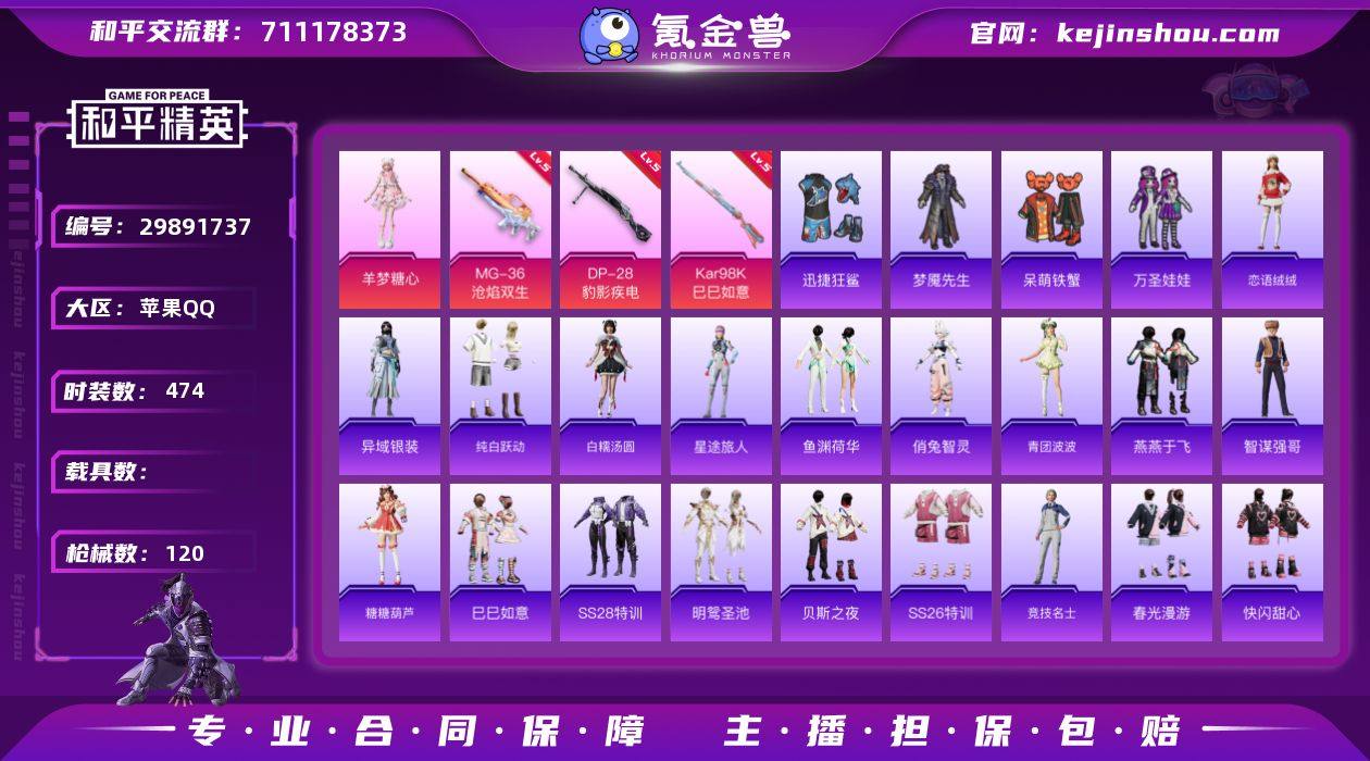 【特价出售】 苹果Q-1粉装4特效枪7热门121套装120枪皮 36037热力值 8印记 历史传奇王牌18星 【1粉装】 羊梦糖心 【4特效枪】 Kar98K-巳巳如意 (5级) MG-36-沧焰双生 (5级) DP-28-豹影疾电 (5级) 汤姆逊-热量炸弹 (5级) 【7热门】 龟仙人 梦魇先生 呆萌铁蟹 万圣娃娃 迅捷狂鲨 破蛋小黄鸡 极速红龙 【1头盔】 深海小丑鱼头盔 【1背包】 深海小丑鱼背包