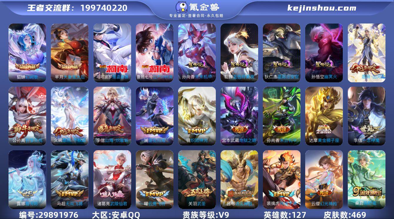 0AF93V可二次468皮肤水晶2珍品传说2传说31优质限定36 信用分合格 钱包已注销手势解锁L 社交限制 李信全皮,干将莫邪全皮, 水晶皮肤:大秦宣太后,幻阙歌, 珍品传说皮肤:江户川柯南,怪盗基德, 新传说限定:愿照·山河定,祥瑞亨通,愿照·千秋盛, 传说限定:遇见神鼓,武圣,山海·炽霜斩,至美·化雀舞,画中仙,武陵仙君,祈雪灵祝,太华,启明星使, 新传说皮肤:幻光神枪, 传说皮肤:一念神魔,霜月吟,澜逐花归海,末日机甲-孙尚香,灼幽烈阳,黄金狮子座,无双飞将,淬星耀世,地狱之眼,诗剑行,地狱火,云鹰飞将,炽阳神光,仲夏夜之梦,黄金白羊座,久胜战神,超时空战士-狄仁杰,鸣野蒿, 新史诗限定:浮光幕影,器灵·浮梦炉,至美·乘鲤谣,陌上桑,幻珠鲛人, 史诗限定:冰锋战神,百相守梦(关羽),瑞麟志,默契交锋-花木兰,飞衡,傲雪梅枪,至尊宝,大圣娶亲,孙行者,鹤归松栖(赵怀真),凤凰于飞,寅虎·心曲,冰霜恋舞曲,炽弈燎原,神器·万象笔,山海·玄木吟,辉光之辰,山海·碧波行,逐梦之音, 新史诗皮肤:戍鼓铭心,苍鳞隐世,糖绘人间,灵蛊蚀心,石田雨龙,百相守梦-黄忠, 优质史诗皮肤:圣诞老人,天秀·启明,雪上飞焰,永昼,嘻哈天王,暗渊魔法,晚萤,修罗,青蛇,唤灵魅影,时之奇旅-安琪拉,魅语,诗语江南,时之恋人-孙尚香, 周年皮肤:李小龙,江河有灵,游园惊梦,遇见飞天,梁祝,高山流水,五谷丰年, 珍宝阁:妄想食味,胡桃夹子,女武神, 史诗皮肤:地狱岩魂,星夜王子,圣诞狂欢,末日机甲-吕布,无心,乘风破浪,幽灵船长,苍穹之光,功夫厨神,德古拉伯爵,水晶猎龙者,心灵战警,猫狗日记-孙策,未来纪元-赵云,暗夜猫娘,节奏热浪,鬼剑武藏,千年之狐,紫霞仙子,暗隐猎兽者,美猴王,冰冠公主,黎明之约,曙光守护者,原初追逐者,热力回旋,纤云弄巧,缤纷独角兽,金属风暴,龙骑士,魅力维加斯,女仆咖啡,摇滚巨星,暗夜贵公子,冰雪圆舞曲,圣诞恋歌,心灵骇客,偶像歌手,黄金分...