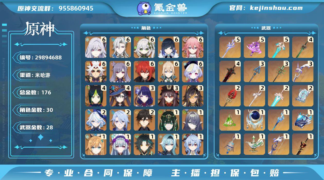 冒险等级:60 总黄数:176 男/女主:男主 5星角色数:30 5星武器数:28 纠缠之源数量:0 原石数量:1721 卖家说:满命满精丝柯克最强配队,抽的时候充了很多钱,没时间玩了,邮箱因为工作原因不能送