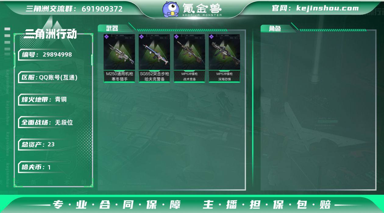 总资产:23.6M 顶级安全箱(3×3)1.28号到期 哈夫币:1.462K 可二次 可修改实名 【烽火地带段位】:青铜 【全面战场段位】:无段位 【史诗武器皮肤】:SG552突击步枪-哈夫克警备,MP5冲锋枪-战术竞备,MP5冲锋枪-深海恐惧,M250通用机枪-寒冬猎手