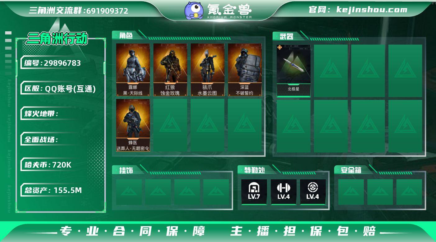 S212总资产155.5M哈弗币72w行动等级60,红狼-蚀金玫瑰/蜂医-送葬人无题密令/深蓝-不破誓约/露娜-黑天际线/骇爪-水墨云图/近战-北极星/安全箱等时效性道具请以游戏内数据为准;详情请看图