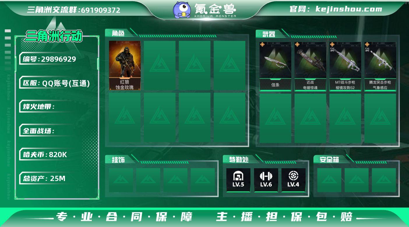 S174总资产25M,哈夫币82w,典藏2 近战3 枪皮数量82,红狼-蚀金玫瑰/深蓝-不破誓约,近战-信条/近战-电锯惊魂,M7战斗步枪-棱镜攻势(优品A)/腾龙突击步枪-气象感应(优品B)战场等级1 列兵, 行动等级60 铂金,安全箱等时效性道具请以游戏内数据为准,详情请看图
