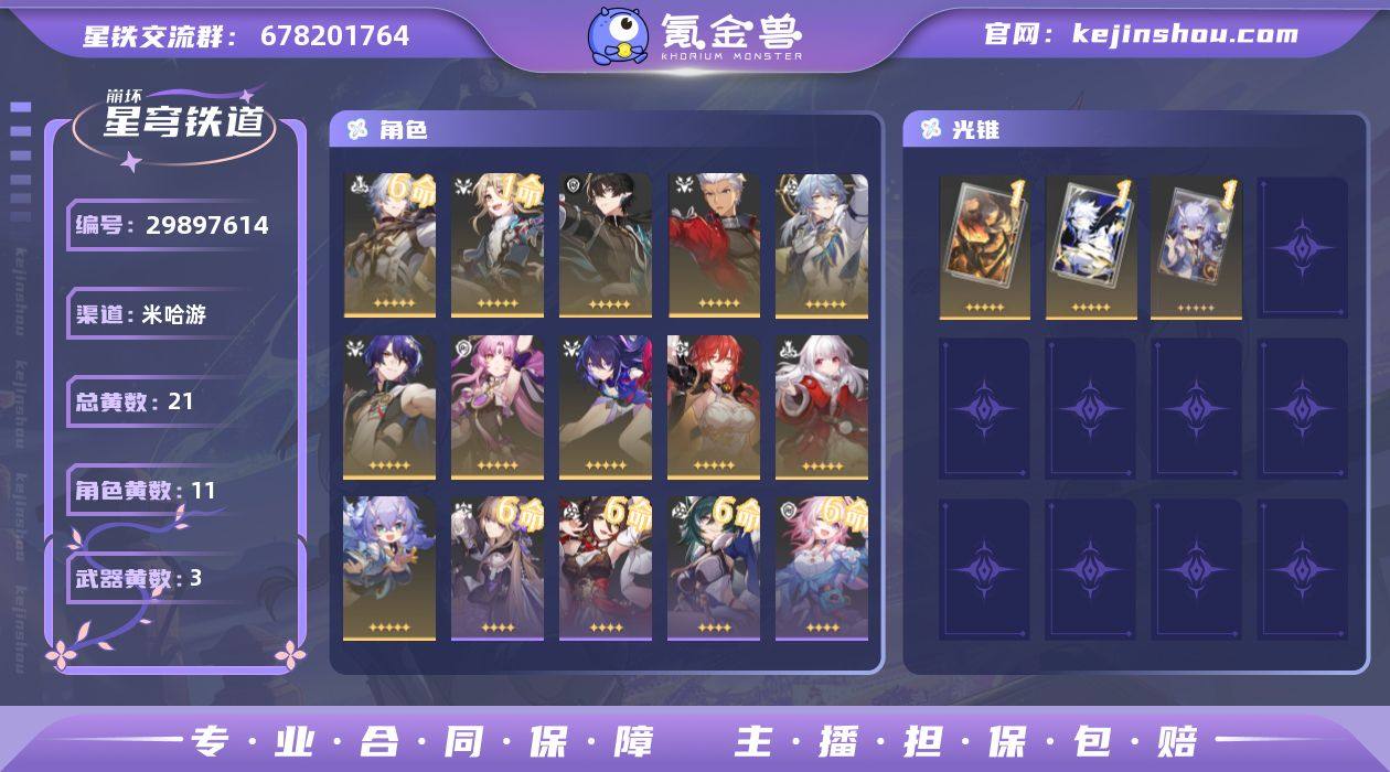 开拓等级:67 开拓者性别:女 总黄数:21 星轨专票:0 五星角色数:11 6命白厄,1命彦卿,0命丹恒·腾荒,0命Archer,0命星期日,0命真理医生,0命符玄,0命希儿,0命姬子,0命克拉拉,0命白露 五星光锥数:3 1精理想燃烧的地狱,1精黎明恰如此燃烧,1精时节不居 邮箱状态:不送邮