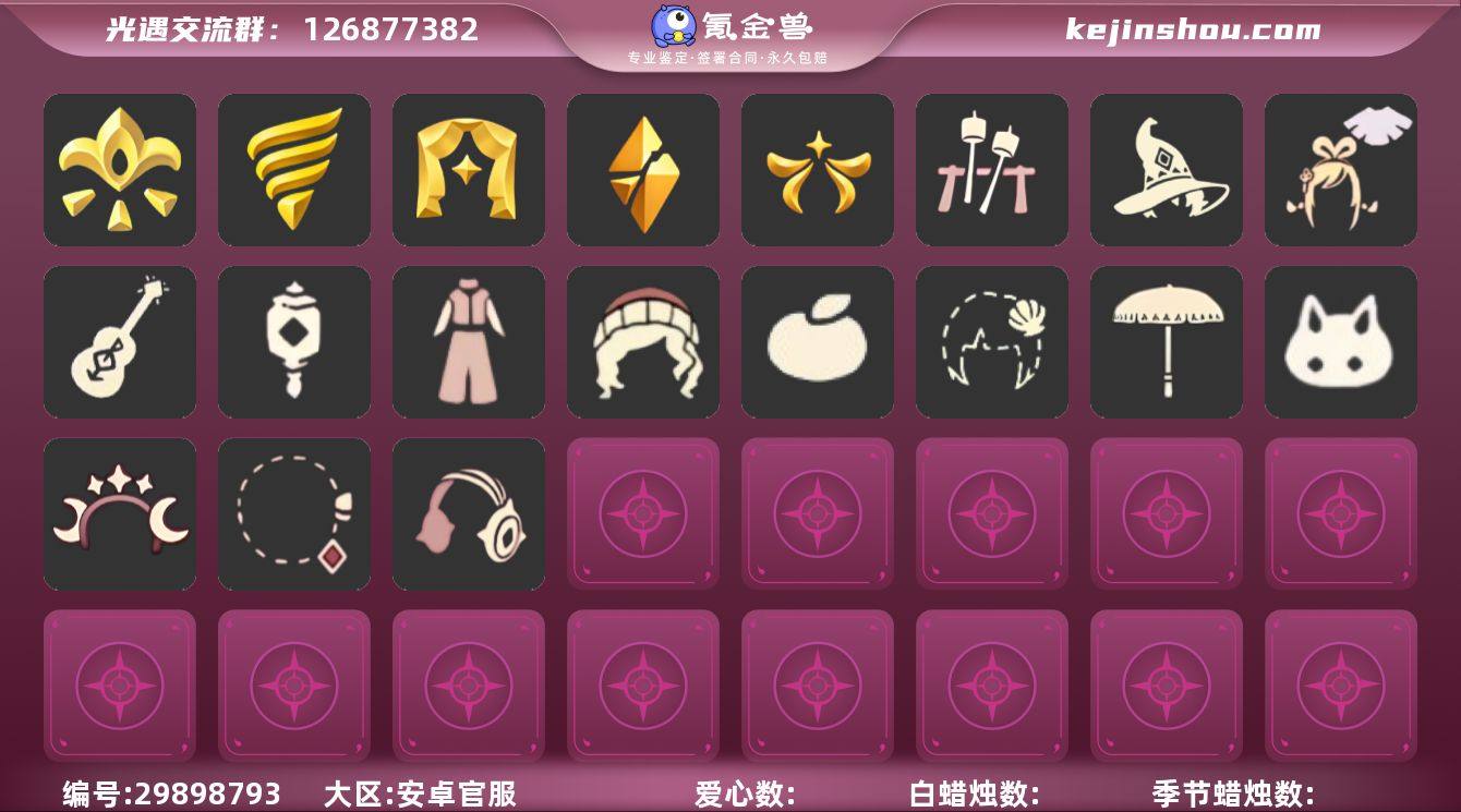 账号类型: 邮箱账号 季节已毕业: 潜海季,表演季,破晓季,欧若拉季,集结季 礼包: 巫师,绊爱,吉他,灯笼,奔跑裤子,彩虹帽,橘子,贝壳,黄伞,兔子,星月头饰,彩虹耳钉,彩虹耳机,篝火点心礼包