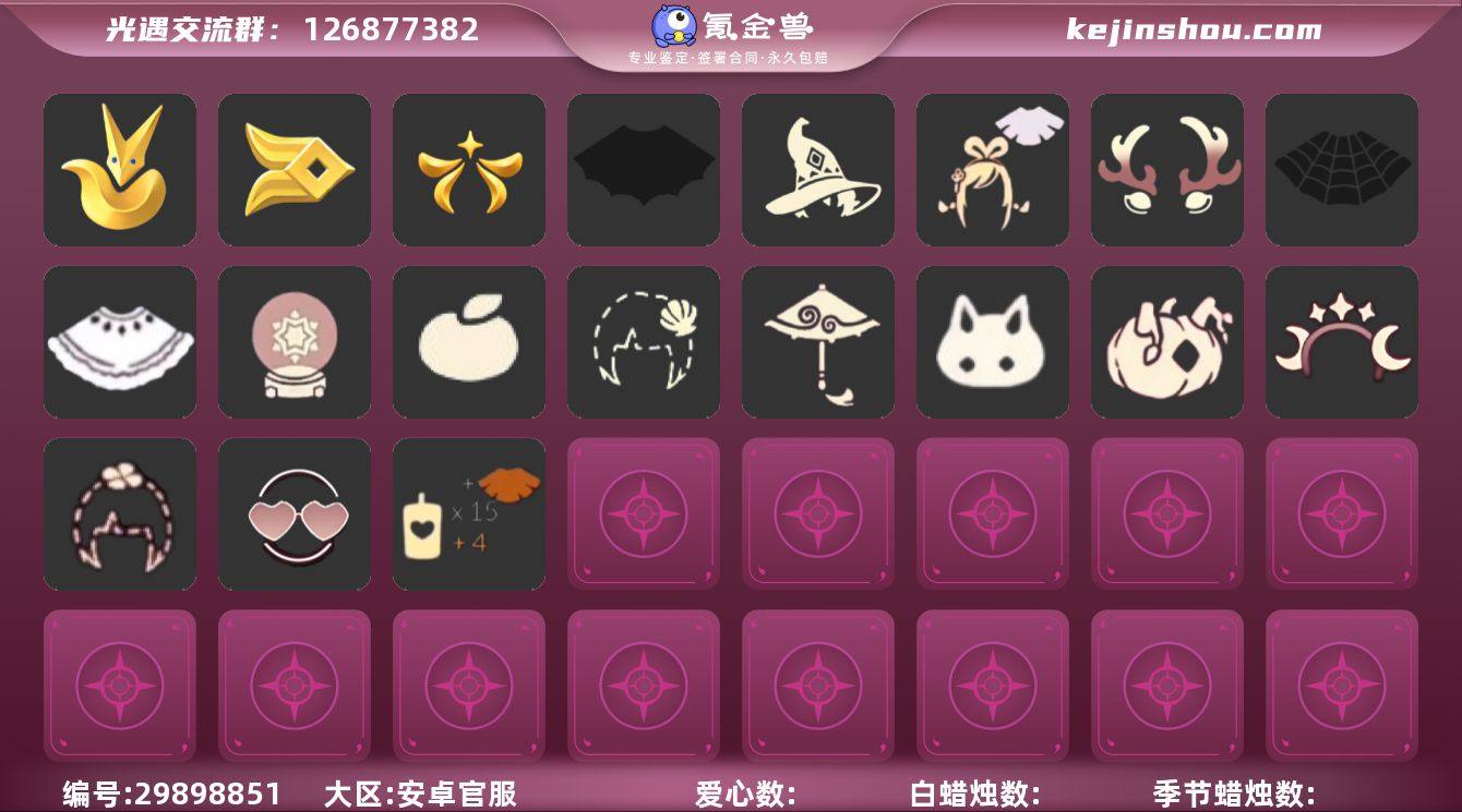 账号类型: 手机账号 季节已毕业: 小王子季,风行季,欧若拉季 完成地图: 晨岛,云野,雨林,霞谷,暮土,禁阁 礼包: 蝙蝠套,巫师,绊爱,鹿角,蜘蛛斗,白绒金,雪花球,橘子,贝壳,红伞,兔子,南瓜,星月头饰,四叶草,爱心眼镜,创始人
