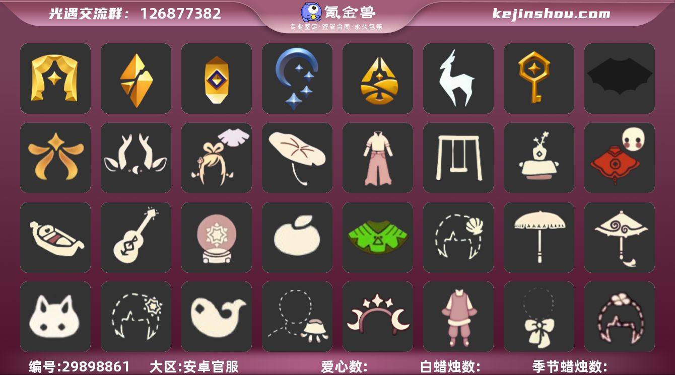 账号类型: 手机账号 季节已毕业: 表演季,破晓季,夜行季,追忆季,归巢季,九色鹿季,筑巢季 完成地图: 晨岛,云野,雨林,霞谷,暮土 礼包: 蝙蝠套,欧若拉之翼,九色鹿角,绊爱,荷叶伞,牛仔裤,秋千,茶桌,福娃,小船,吉他,雪花球,橘子,粽叶,贝壳,黄伞,红伞,兔子,雪花,鲤鱼,棉花糖,水母,星月头饰,新年裤,蝴蝶结,四叶草,新年耳钉,创始人,海蓝波浪发型
