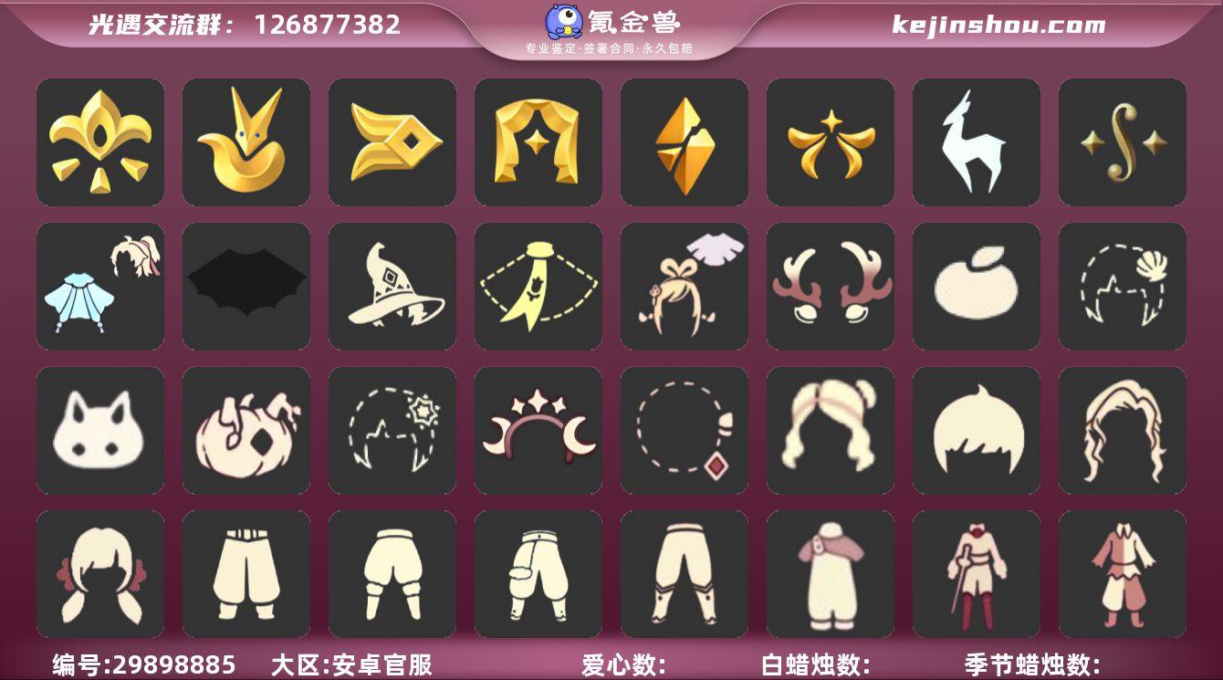 账号类型: 手机账号 季节已毕业: 小王子季,风行季,表演季,破晓季,欧若拉季,集结季,九色鹿季,二重奏季 完成地图: 晨岛,云野,雨林,霞谷,暮土,禁阁 珍稀物品: 白枭,透明蝶翼斗,玫瑰花 礼包: 蝙蝠套,巫师,围巾,绊爱,鹿角,橘子,贝壳,兔子,南瓜,雪花,星月头饰,彩虹耳钉,青衫落拓礼包 裤子: 武士裤,背带裤,白棉裤,紧身裤,搓澡巾,击剑裤,小丑裤 面具: 黄鼠狼,玫瑰花面具,单边眼罩 项链: 粉色蝴蝶结,围巾,螃蟹肩饰,青鸟毕业项链 发型: 正太,樱花,公主,虚荣 斗篷: 白金,红金,紫斗篷,花瓣斗篷,彩虹斗 配饰: 吉他,笛子,玫瑰花 亮点: 圆菇,平菇,斜太,祥云斗,枫叶斗,加绒红色斗篷,铃铛,长号,大提琴,手鼓,打鼓,更多亮点尽在详情!