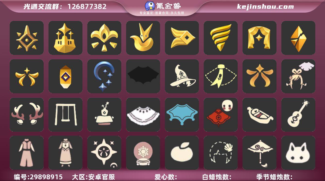 账号类型: 手机账号 季节已毕业: 预言季,梦想季,小王子季,风行季,潜海季,表演季,破晓季,欧若拉季,集结季,夜行季,追忆季 珍稀物品: 阿努比斯(狗头),白枭,透明蝶翼斗,玫瑰花 礼包: 蝙蝠套,巫师,围巾,欧若拉之翼,绊爱,鹿角,秋千,茶桌,白绒金,瑞雪,福娃,小船,吉他,奔跑裤子,致爱装扮,人声乐器,雪花球,橘子,贝壳,红伞,兔子,南瓜,雪花,tgc,星月头饰,彩虹耳钉,彩虹耳机,雪怪斗,魔法棒,海螺,四叶草,雪人鞋,优雅三件套 裤子: 武士裤,背带裤,白棉裤,紧身裤,搓澡巾,连体裤,击剑裤 鞋子: 布鞋 面具: 黄鼠狼,红狐狸,兔头,玫瑰花面具,受伤面具 项链: 围巾,螃蟹肩饰 发型: 正太,樱花,公主,虚荣,猫耳 斗篷: 白金,红金,黑金,白鸟斗,紫斗篷,花瓣斗篷,彩虹斗,红绒斗篷,绿芽 配饰: 雨伞,排箫,吉他,笛子,帐篷,气球,坐垫,手持小铃铛,大铃铛乐器,乐器 亮点: 奔离远行发型,夏日有友礼包,祥云瑞气服饰,平菇,火焰头,高马尾,斜太,斗笠,疯帽,祥云斗,枫叶斗,小号