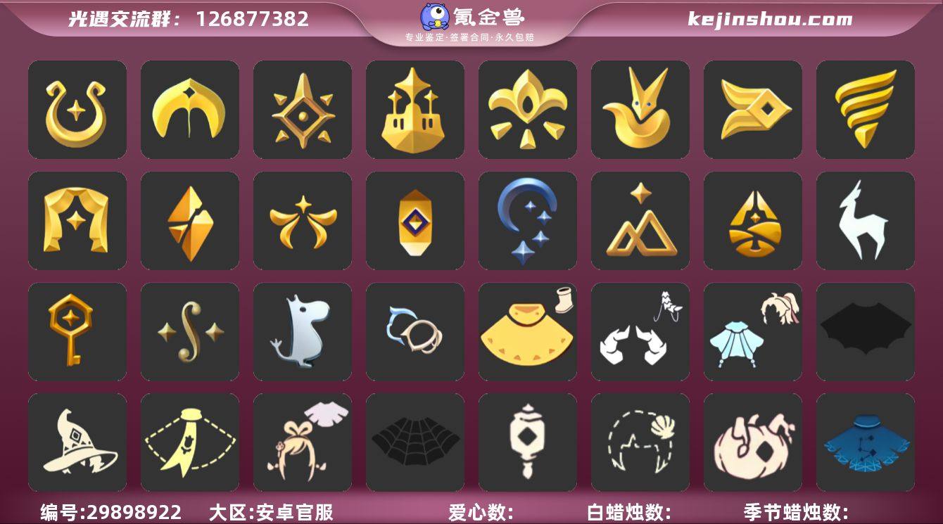 账号类型: 手机账号 季节已毕业: 魔法季,圣岛季,预言季,梦想季,小王子季,风行季,潜海季,表演季,破晓季,欧若拉季,集结季,夜行季,追忆季,拾光季,归巢季,九色鹿季,筑巢季,二重奏季,姆明季,双星季 完成地图: 晨岛,云野,雨林,霞谷,暮土,禁阁 珍稀物品: 阿努比斯(狗头),白枭,透明蝶翼斗,魔法季耳坠,玫瑰花 礼包: 蝙蝠套,巫师,围巾,绊爱,蜘蛛斗,灯笼,贝壳,南瓜,线框斗,青衫落拓礼包,小黄鸭雨衣套装礼包,冥龙套装礼包 裤子: 武士裤,背带裤,白棉裤,紧身裤,搓澡巾,连体裤,击剑裤,万圣裤 鞋子: 万圣鞋,鱼嘴凉靴,人字拖,长筒凉鞋,凉鞋,布鞋 面具: 黄鼠狼,红狐狸,牛头,泪痣面具,螃蟹面具,九色鹿面具,龙头,兔头,玫瑰花面具,鹌鹑面具,双边长胡子面具,右眼竖纹面具,右眼泪痕面具,忧郁脸面具 面饰: 魔法季耳坠 项链: 铃铛,粉色蝴蝶结,围巾,海龟项链,小王子季节项链,螃蟹肩饰 发型: 正太,高马尾,樱花,书虫,虚荣,猫耳,白枭 头饰: 红色耳机 斗篷: 白金,红金,黑金,白鸟斗,紫斗篷,花瓣斗篷,彩虹斗,红绒斗篷,绿芽 配饰: 雨伞,排箫,高音钢琴,原木台灯,吉他,笛子,口琴,玫瑰花,帐篷,气球,礼炮,坐垫,大提琴,手持小铃铛,大铃铛乐器,圆鼓,乐器 亮点: 平菇,爆炸头,斗笠,火焰头,斜太,失孤,萨克斯,电影卡板