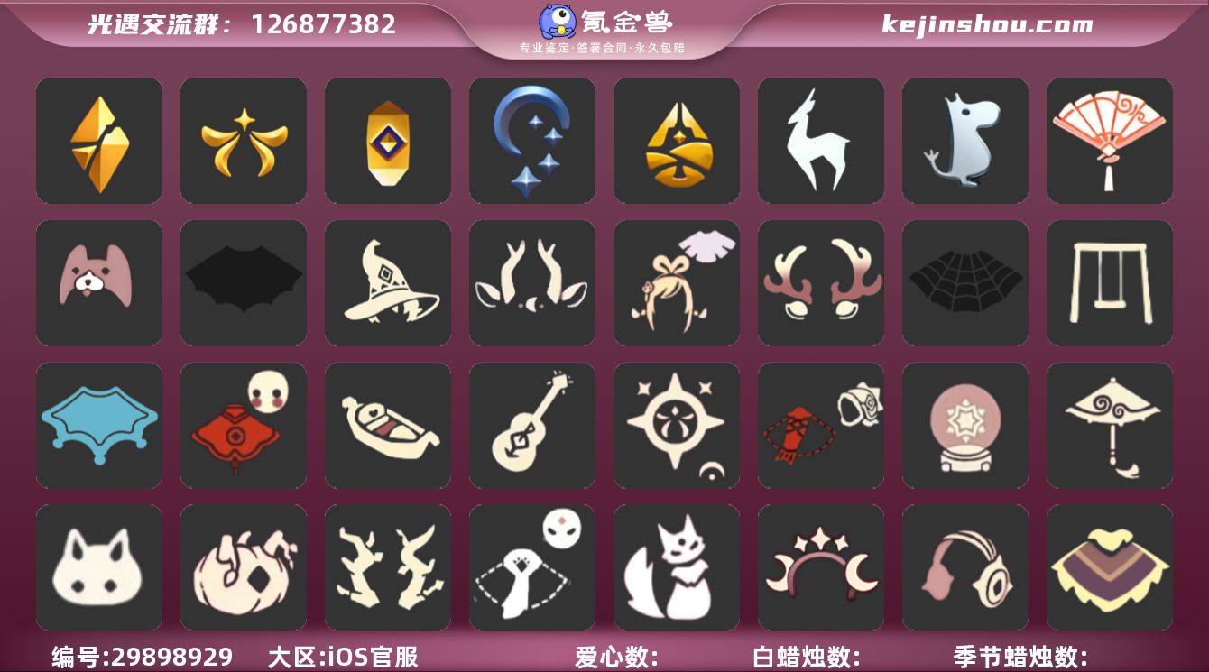 账号类型: 手机账号 季节已毕业: 破晓季,欧若拉季,夜行季,追忆季,归巢季,九色鹿季,姆明季 完成地图: 晨岛,雨林,霞谷 礼包: 蝙蝠套,巫师,九色鹿角,绊爱,鹿角,蜘蛛斗,秋千,瑞雪,福娃,小船,吉他,人声乐器,鲤鱼套,雪花球,红伞,兔子,南瓜,枯角,猫套,猫背饰,星月头饰,彩虹耳机,雪怪斗,四叶草,飞蛾套,夹袄斗,龙纹斗,献瑞折扇礼包,小狗周年发饰