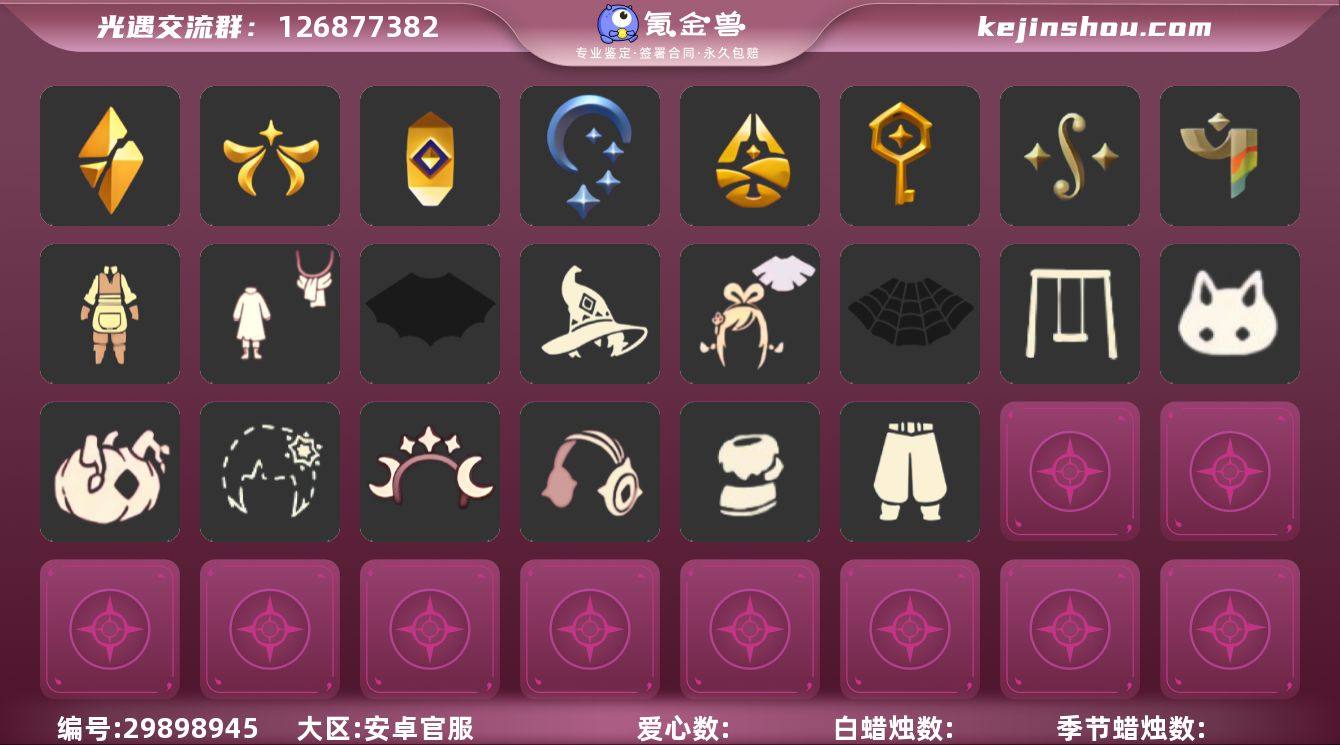 账号类型: 手机账号 季节已毕业: 潜海季,表演季,破晓季,欧若拉季,夜行季,追忆季,拾光季 完成地图: 晨岛,云野,雨林,霞谷,暮土,禁阁 珍稀物品: 白枭,透明蝶翼斗 礼包: 蝙蝠套,巫师,绊爱,鹿角,秋千,茶桌,瑞雪,福娃,吉他,红伞,兔子,枯角,猫背饰,彩虹耳钉,蝴蝶结,四叶草,云音伴游耳机 裤子: 武士裤,背带裤,搓澡巾,蓝绿裤,飞天裤 面具: 呼吸面具,夜行毕业面具,黄眉企鹅面具 面饰: 红耳机,黑框眼镜 项链: 围巾 发型: 若笠,虚荣,单侧绑发,留辫蘑菇头 头饰: 牛仔帽,蓝色音乐会,平顶帽 斗篷: 海洋斗,绿芽,粉红绒毛斗篷,遥鲲斗篷,燕尾斗篷,冥龙斗篷 配饰: 雨伞,高音钢琴,相机,鲲灯 亮点: 【优质装备】:表演季,白枭(帝企鹅发),武士裤,潜海季,破晓季,透明蝶翼斗,欧若拉季(欧若拉),高音钢琴(白色高脚钢琴),夜行季,追忆季,牛仔帽(西部帽),相机(季卡相机),拾光季,蓝绿裤(高领舞服),飞天裤(柔缎花边连)(九色鹿丝带裤),围巾(肩带),呼吸面具(潜水面具),夜行毕业面具(棕熊面具),黄眉企鹅面具,黑框眼镜(粗框眼镜),单侧绑发(单边小辫),留辫蘑菇头,粉红绒毛斗篷(绒毛斗篷),遥鲲斗篷(双翼遥鲲斗),燕尾斗篷,冥龙斗篷,鲲灯(追忆之书),蝙蝠套(蝙蝠斗篷)(南瓜头),福娃(福娃礼包)(春之日礼包)(铜钱斗),绊爱(绊爱斗篷)(绊爱礼包),秋千(情人秋千),茶桌(花憩茶桌),红耳机,鹿角(圣诞鹿角),瑞雪(瑞雪斗篷)(暖冬瑞雪),吉他(音韵吉他)(白吉他),红伞(瑞气纸伞),巫师(巫师帽),枯角(巫树犄角),猫背饰(猫咪背饰),晨岛,云野,雨林,霞谷,墓土(暮土),禁阁,若笠(箬笠),蝴蝶结(大蝴蝶结),兔子(玉兔头饰)(玉兔发饰)(兔子发饰),彩虹耳钉(彩虹耳饰),四叶草(四叶草头饰)