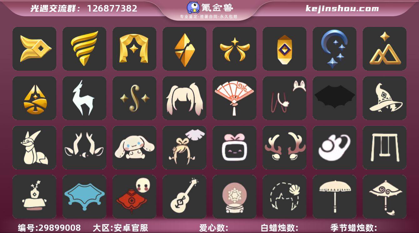 账号类型: 邮箱账号 季节已毕业: 风行季,潜海季,表演季,破晓季,欧若拉季,夜行季,追忆季,拾光季,归巢季,九色鹿季,二重奏季 珍稀物品: 白枭,透明蝶翼斗,玫瑰花 礼包: 蝙蝠套,巫师,小狐狸,九色鹿角,大耳狗抱枕,绊爱,大铁头,鹿角,兔子鞋,秋千,茶桌,瑞雪,福娃,吉他,雪花球,贝壳,黄伞,红伞,兔子,南瓜,枯角,彩虹耳机,小提琴,姆明饰品套装,献瑞折扇礼包,渐变双马尾发型礼包 裤子: 武士裤,背带裤,白棉裤,紧身裤,搓澡巾,连体裤,击剑裤,小丑裤 鞋子: 鱼嘴凉靴,皮鞋,人字拖,布鞋 面具: 黄鼠狼,红狐狸,虎头,龙头,兔头,玫瑰花面具 项链: 铃铛,围巾,螃蟹肩饰 发型: 正太,樱花,公主,猫耳 斗篷: 白金,红金,黑金,白鸟斗,紫斗篷,樱花斗,彩虹斗,红绒斗篷,绿芽 配饰: 雨伞,排箫,高音钢琴,吉他,笛子,气球,坐垫,手持小铃铛,大铃铛乐器,乐器 亮点: 金鳞耳坠,冥龙南瓜,彩染半毕业,姆明半毕业,风行半毕业,平菇,斜太,失孤,蝴蝶结,海洋斗,枫叶斗