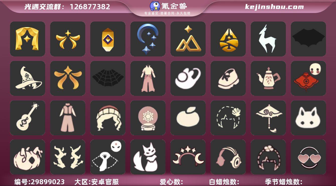 账号类型: 手机账号 季节已毕业: 表演季,欧若拉季,夜行季,追忆季,拾光季,归巢季,九色鹿季 礼包: 蝙蝠套,巫师,欧若拉之翼,蜘蛛斗,牛仔裤,兔子鞋,运动鞋,茶壶,福娃,吉他,奔跑裤子,彩虹帽,雪花球,橘子,贝壳,红伞,兔子,南瓜,枯角,猫套,猫背饰,星月头饰,彩虹耳机,四叶草,爱心眼镜,火焰眼镜,透明蛛丝,雪人鞋,创始人,线框斗