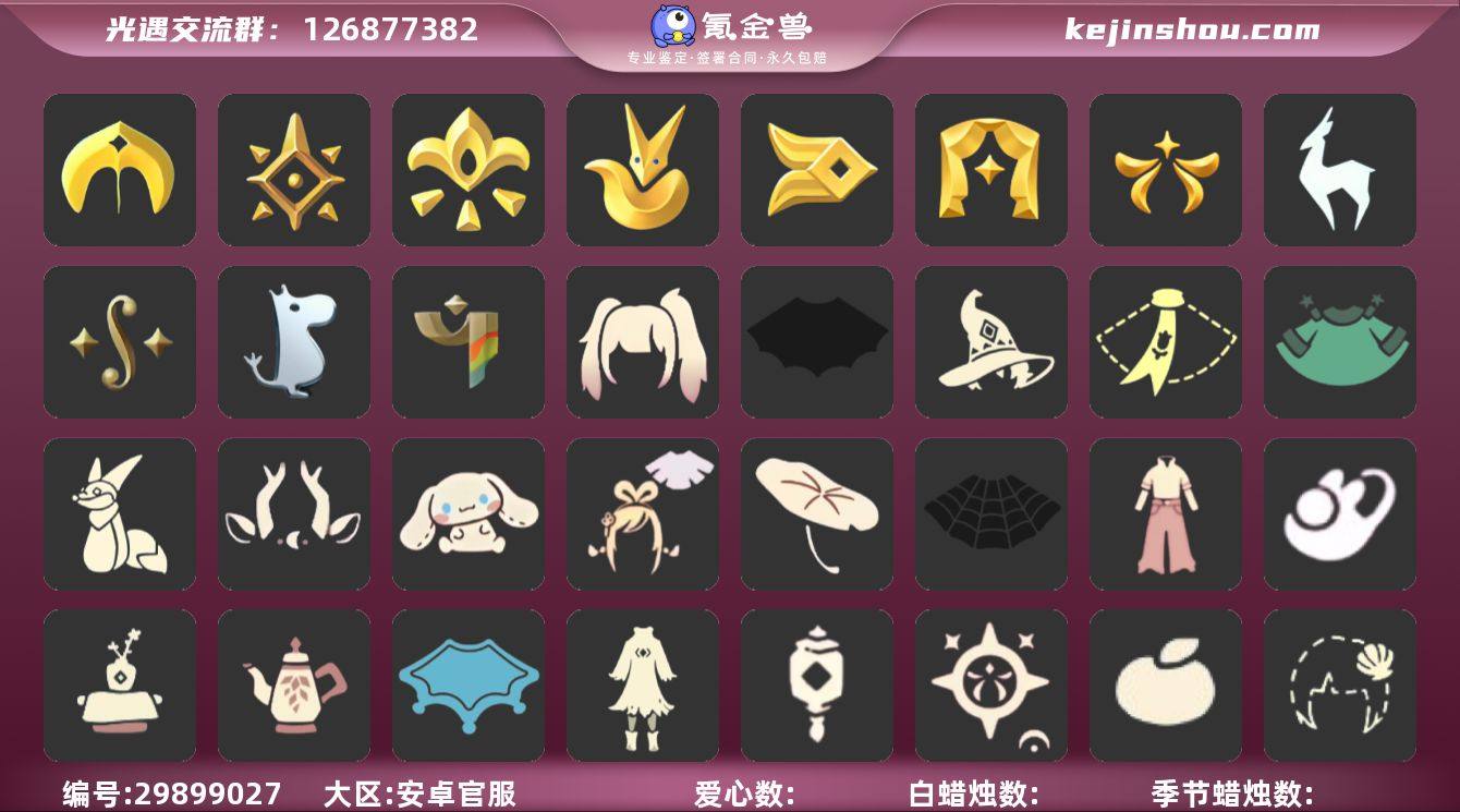 账号类型: 手机账号 季节已毕业: 圣岛季,预言季,小王子季,风行季,表演季,欧若拉季,集结季,九色鹿季,二重奏季,姆明季,彩染季 完成地图: 晨岛,云野,雨林,霞谷,暮土,禁阁 珍稀物品: 阿努比斯(狗头) 礼包: 蝙蝠套,巫师,围巾,星球斗,小狐狸,九色鹿角,大耳狗抱枕,绊爱,荷叶伞,蜘蛛斗,牛仔裤,兔子鞋,茶桌,茶壶,瑞雪,女巫裙,灯笼,人声乐器,橘子,贝壳,兔子,南瓜,枯角,tgc,彩虹耳钉,彩虹耳机,四叶草,日光耳环,线框斗,渐变双马尾发型礼包