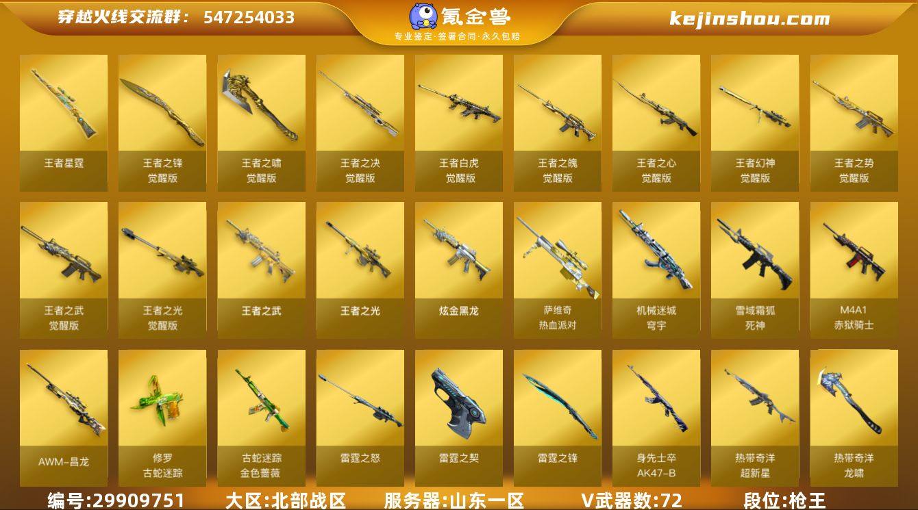 段位:枪王 VIP等级:VIP5 V武器数:72 王者武器数:17 炫金武器数:1 王者星霆,王者之锋-觉醒版,王者之啸-觉醒版,王者之决-觉醒版,王者白虎-觉醒版,王者之魄-觉醒版,王者之心-觉醒版,王者幻神-觉醒版,王者之势-觉醒版,王者之武-觉醒版,王者之光-觉醒版,王者之武,王者之光 炫金黑龙 萨维奇-热血派对,机械迷城-穹宇,死神-雪域霜狐,M4A1-赤狱骑士,AWM-昌龙,修罗-古蛇迷踪,金色蔷薇-古蛇迷踪,雷霆之怒,雷霆之契,雷霆之锋,AK47-B-身先士卒,超新星-热带奇洋,龙啸-热带奇洋,柯尔特-无冕之王,云龙扇,QBZ03-云龙,AK47-火麒麟,AK47-无影,AK47-雷暴,AK47-黑武士,M4A1-雷神,黑骑士-海王,M4A1-黑骑士,M4A1-死神,M4A1-黑龙,M4A1-雷霆,M4A1-玫瑰精灵,Barrett-毁灭,Barrett-极光,AWM-天龙,AK12-天启,AN94-超新星,QBZ03-金色蔷薇,9A91-烈火,沙鹰-修罗,屠龙,龙啸,麒麟刺,擎天,炽芒蝶刃,柯尔特-荣耀世冠,USP-雷暴,龙啸-荣耀世冠,AK47-B-常胜将军,斩神刀-雷暴,幻灵之锋,AK47-B-战士,AK47-B-战神,AK-47-猩红传说,裁决,天神,雷神-荣耀世冠,火麒麟-荣耀世冠,龙啸-烈火龙威,Barrett-碧霄极光 王者-魅影 春,炽天使,华,零·纪元,魅影,炫,樱,战地猎狐 死神-雪域霜狐-怀旧音效卡,M14EBR-玄武音效卡,M4A1-黑骑士音效卡,Barrett-毁灭音效卡,M4A1-雷神音效卡