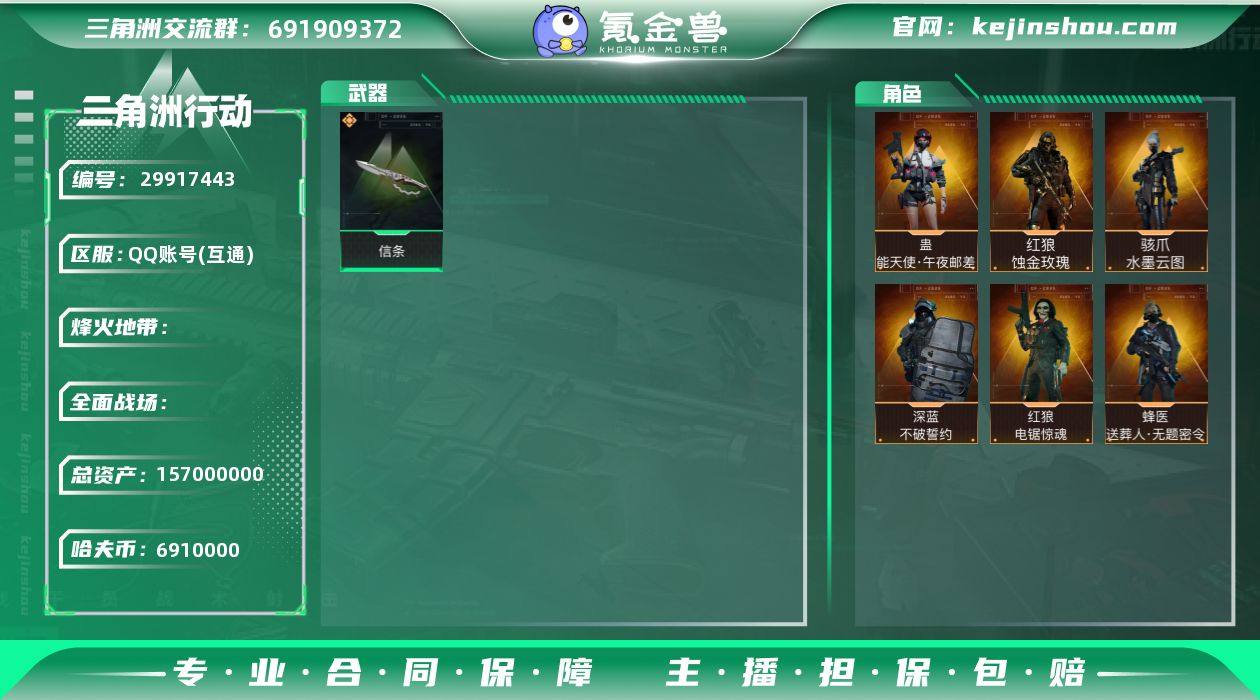 S371总资产157M,哈夫币691w,近战2,枪皮数量171,战场等级21 上等兵,行动等级60 钻石,角色皮肤数量6,蛊-能天使午夜邮差/红狼-蚀金玫瑰/骇爪-水墨云图/红狼-电锯惊魂/深蓝-不破誓约/蜂医-送葬人无题密令,近战-信条/近战-黑鹰,安全箱等时效性道具请以游戏内数据为准;详情请看图