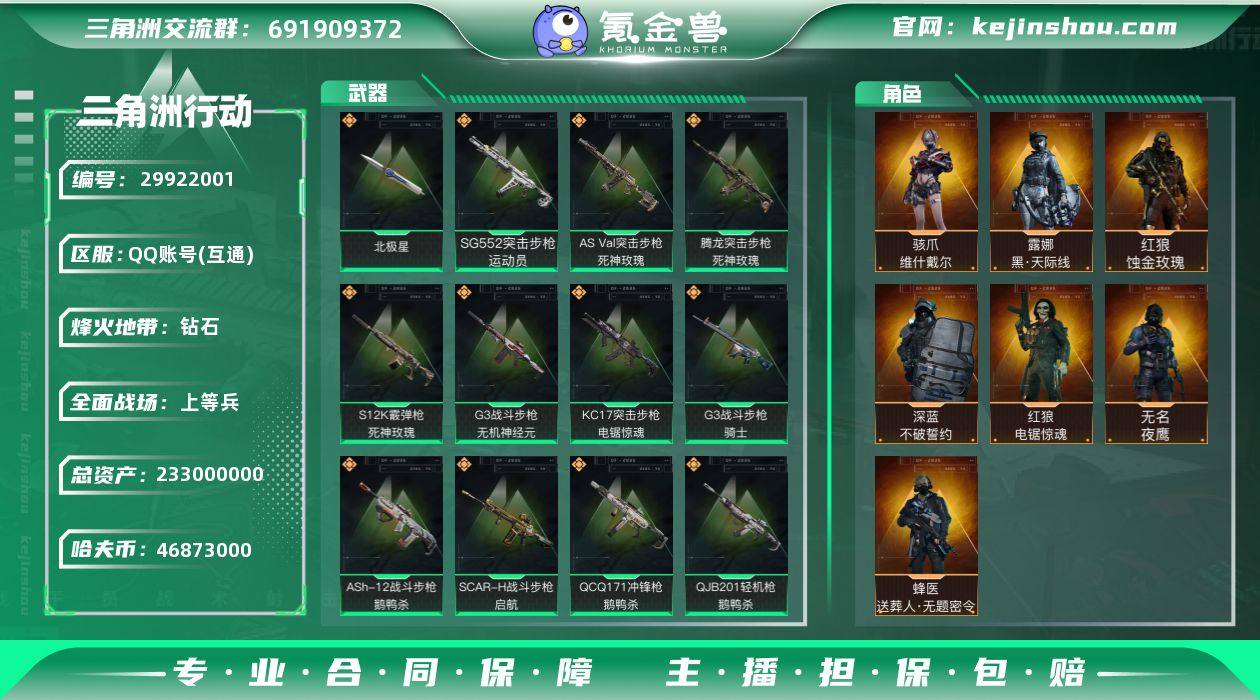 【SJZQH39】总资产(M):233M/哈夫币(K):46873K/哈夫币(K):46873K/全面战场等级:24_段位:上等兵/烽火地带等级:60_段位:钻石/红狼-蚀金玫瑰/露娜-黑·天际线/骇爪-维什戴尔/蜂医-送葬人·无题密令(S5)/无名-夜鹰(S4)/深蓝-不破誓约(S6)/红狼-电锯惊魂/近战-北极星/近战-黑鹰/M4A1突击步枪-蚀金玫瑰/M4A1突击步枪-阿米娅/ASh-12战斗步枪-鹅鸭杀/M16A4突击步枪-狩猎时刻/SG552突击步枪-运动员/AK-12突击步枪-夜鹰/AK-12突击步枪-特斯拉线圈/SCAR-H战斗步枪-启航/G3战斗步枪-狩猎时刻/G3战斗步枪-无机神经元/G3战斗步枪-骑士/CAR-15突击步枪-阿米娅/AS Val突击步枪-死神玫瑰/腾龙突击步枪-死神玫瑰/K437突击步枪-北极星/KC17突击步枪-电锯惊魂/Vector冲锋枪-狩猎时刻/UZI冲锋枪-特斯拉线圈/SMG45冲锋枪-骑士/SR-3M紧凑突击步枪-特斯拉线圈/勇士冲锋枪-能天使-午夜邮差/QCQ171冲锋枪-北极星/QCQ171冲锋枪-鹅鸭杀/S12K霰弹枪-死神玫瑰/725双管霰弹枪-送葬人-无题密令/M250通用机枪-骑士之心/QJB201轻机枪-鹅鸭杀/R93狙击步枪-维什戴尔/复合弓-黑-天际线/AWM狙击步枪-私人定制(典藏)/AKM突击步枪-林中猎手/QBZ95-1突击步枪-星际探索/Ash-12战斗步枪-守夜人/ASh-12战斗步枪-星际探索/ASh-12战斗步枪-无极限/M16A4突击步枪-竞赛选手/AUG突击步枪-蝮蛇/SG552突击步枪-尖端治疗/SG552突击步枪-深海恐惧/SCAR-H战斗步枪-囚徒/G3战斗步枪-流沙送葬/AS Val突击步枪-尖端治疗/AS Val突击步枪-典狱官/AS Val突击步枪-百步穿杨/腾龙突击步枪-无垢/腾龙突击步枪-猎鳄行动/K437突击步枪-守护者/MP5冲锋枪-深海恐惧/MP5冲锋枪-战术竞备/MP5冲锋枪-竞技风/P90冲锋枪-莫斯提马/Vector冲锋枪-阿萨拉文明/Vector冲锋枪-猎鳄行动/Vector冲锋枪-异域战争/SMG-45冲锋枪-星际探索/SR-3M紧凑突击步枪-荒野求生/SR-3M紧凑突击步枪-战术竞备/勇...