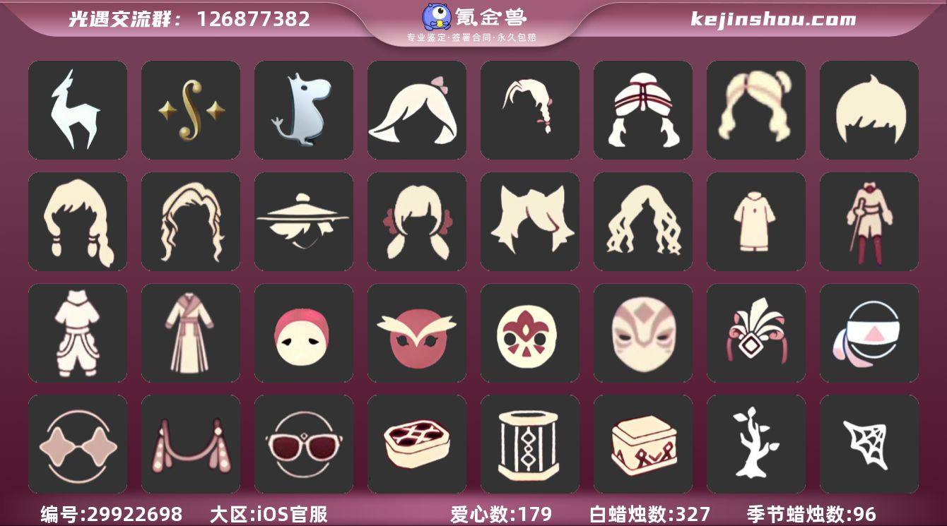 蜡烛数量:327 爱心数量:179 季节蜡烛数量:96 九色鹿季,二重奏季,姆明季 姆明季·斗篷,圣诞斗,彩虹斗,紫罗兰斗,郁金香斗,马蹄莲斗,粉浴巾,蓝浴巾,黄浴巾 马蹄莲发型,玫瑰长辫发型,公主头,公主,正太,书虫,虚荣,若笠,樱花,猫耳,女巫 透明裤子,击剑裤,彩虹裤,古风裤 忧郁脸面具,黑脸白眉面具,花纹面具,九色鹿面具 青鸟占卜智慧面饰,蒙眼面巾,星星眼镜,烟花耳坠,蔚蓝眼镜 叠叠南瓜,诡橘树枝,冥龙地毯,谜题盒,谜题笼,谜题箱,蛛网挂饰,莲叶浴桶,玉兔尾巴,月相挂画,螃蟹,粽叶吊床,玫瑰小盆栽,寻宝铲,繁花拱门,小风车,相机,钟,房子相片,小桥相片,吊灯,口琴,姆明季帐篷,小红伞,姆明抱枕,姆明全家福,钢琴键横挂画,雨林艺术壁,悬挂花盆,原木舒适浴,原木茶桌,原木单人床,单人沙发木,云野壁画集,原木置物架,原木双人沙,原木壁挂香,原木台灯,原木花型吊,树枝艺术吊,光球,吉他,高音钢琴,玉桂狗茶桌,火盆,帐篷,圣诞椅,万圣椅,雪桶,蹦迪灯,气球,礼炮,坐垫,爱心抱枕,七夕挂饰,向日葵,三角钢琴,彩色三角钢琴,大提琴,彩色大提琴,浅色地毯,深色地毯,大提琴挂画,钢琴挂画,波浪琴键挂画,海螺挂画,二重奏挂画 网纱礼帽,樱花头饰,古代发饰,蝴蝶发饰,小鸟头饰,羽毛发卡,猫猫头套,花环-头饰,蝴蝶结-头饰,玉桂狗茶壶,珊瑚,太阳帽,生日帽,贝雷帽,皇冠,小丑帽,魔术帽,螃蟹南瓜,松果发饰,向日葵发箍,时尚暗黑发饰 青鸟毕业项链,九色鹿季节项链,螃蟹肩饰,姆明季围巾,铃铛,二重奏季项链,黑色领结,橙色围脖,海龟项链,圣诞领结 长筒凉鞋,姆明季·鞋子,万圣鞋,芭蕾鞋 纤云弄巧礼包,活力海牛礼包,粽子发饰礼包,彩虹武士裤,巫师,九色鹿角,大耳狗抱枕,兔子鞋,运动鞋,南瓜,电吉他,猫套,星月头饰,四叶草,满月耳坠 卖家说:每个地图都是50%,因为是无翼,所以斗篷很少,有彩虹裤子,还有兔子拖鞋,像热门的发型也有