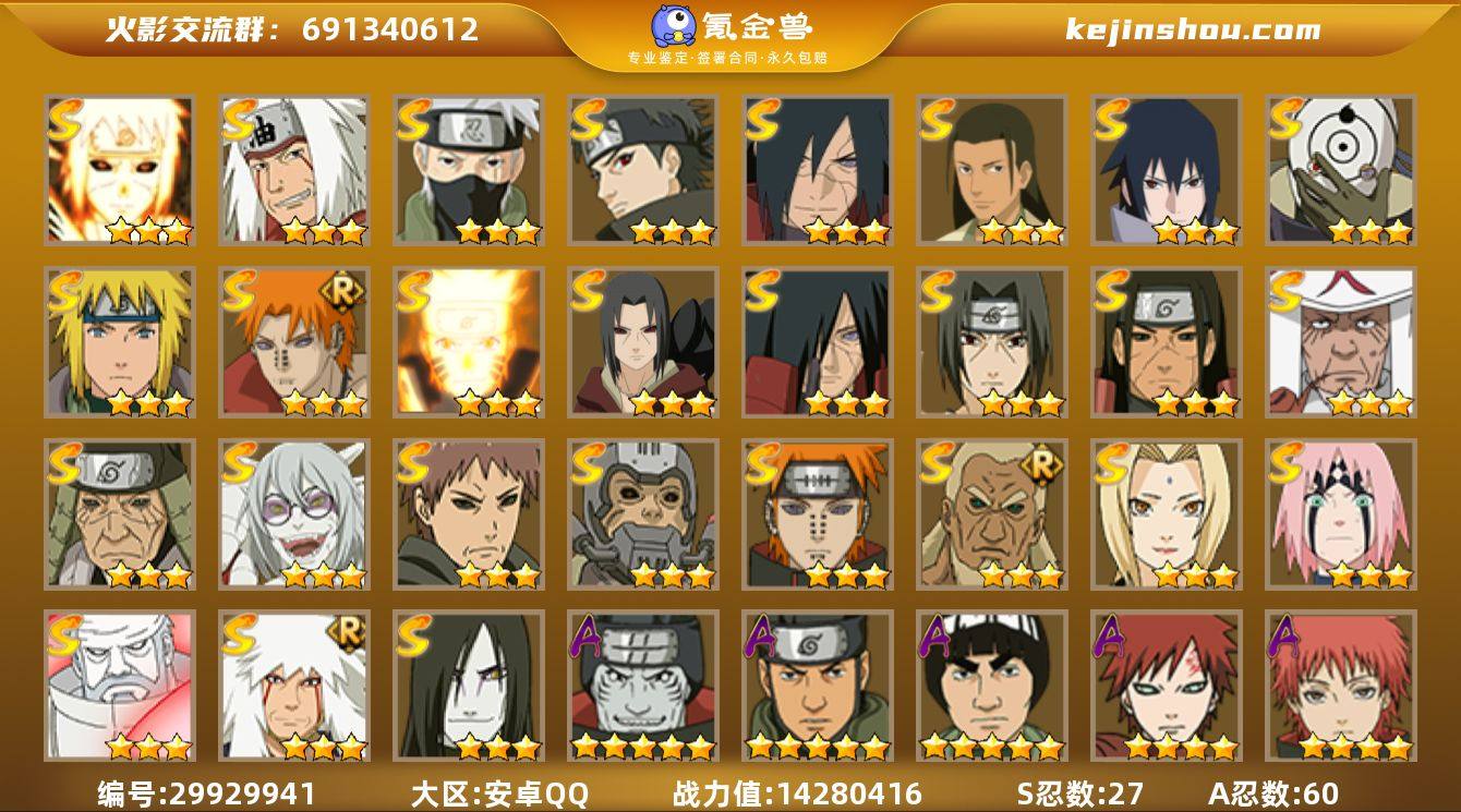 实名:不可二次实名 贵族等级:V14 战力值:14280416 S忍数:27 A忍数:60 三星波风水门「九喇嘛连结」,三星自来也「传说中的三忍」,三星旗木卡卡西「须佐能乎」,三星宇智波止水「须佐能乎」,三星宇智波斑「秽土转生·解」,三星千手柱间·木叶创立,三星宇智波佐助「永恒万花筒」,三星宇智波斑「白面具」,三星波风水门,三星佩恩·天道「超」,三星漩涡鸣人「九喇嘛连结」,三星宇智波鼬「秽土转生」,三星宇智波斑「秽土转生」,三星宇智波鼬「须佐能乎」,三星千手柱间「秽土转生」,三星猿飞日斩,三星猿飞日斩「秽土转生」,三星药师兜「仙人模式」,三星罗砂「四代目风影」,三星半藏「秽土转生」,三星佩恩「天道」,三星艾「三代目雷影」,三星纲手,三星春野樱「忍界大战」,三星大筒木金式「博人传」,三星自来也「舞之豪杰」,三星大蛇丸 五星干柿鬼鲛,五星猿飞阿斯玛,五星迈特凯,四星我爱罗「疾风传」,四星蝎,三星土台「忍界大战」,三星黑土「博人传」,三星飞段,三星旗木卡卡西,二星大野木「侠隐江湖」,二星机械鸣人「初始形态」,二星桃地再不斩「秽土转生」,二星神农「羁绊」,二星宇智波泉奈,二星蝎「绯流琥」,二星不动,二星角都「秽土转生」,二星李洛克「忍界大战」,二星日向雏田「最终章」,二星漩涡博人「桃式显现」,二星日向宁次·忍界大战,二星不缘,二星长十郎「六代目水影」,二星长门「青年」,二星艾「青年」,二星达鲁伊「五代目雷影」,二星神秘面具男「忍者之路」,二星波风水门「青年」,二星旗木卡卡西「元气夏日」,二星千手扉间「漂泊武士」,二星奇拉比「忍界大战」,二星宇智波止水「新春限定」,二星飞段「恶灵之影」,二星宇智波佐助「须佐能乎」,二星桃地再不斩「漂泊武士」,二星迪达拉「秽土转生」,二星旗木卡卡西「忍界大战」,二星宇智波带土「暴怒」,二星猿飞木叶丸「博人传」,二星漩涡鸣人「九尾查克拉」,二星千代「近松十人卫」,二星药师兜「半蛇斗篷」,二星宇智波鼬「新春限定」,二星宇智波佐助「疾风传咒印」,二星我爱罗「忍界大战」,二星小南「夏日泳装」,二星秋道丁次「忍界大战」,二星大蛇丸「晓」,二星春野樱「百豪」,二星波风水门「新春限定」,二星照美冥「五代目水影」,二星宇智波佐助「万花筒写轮眼」,二星奇拉比,二星漩涡鸣人「仙人模式」,二星旗木卡卡西「万花筒写轮眼」,二星蝎「百机操演」,二星飞段「死司凭血」,二星小南,二星迪达拉,二星宇智波鼬 卖家说:王者2荣耀24传说,金铲子5神话具体问