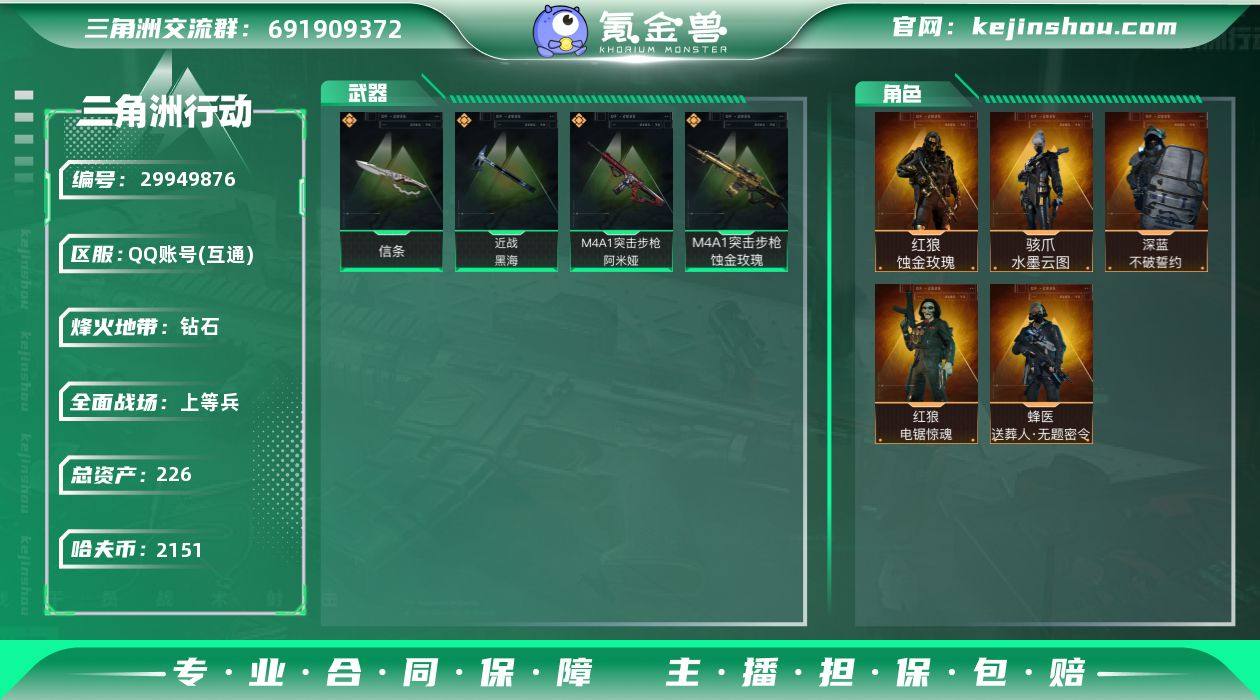 /QQ/哈夫币2151W/总资产226.7M/行动等级60/战场等级50/高级安全箱(限时54天)/【近战】/信条/黑海/【特战干员】/红狼蚀金玫瑰/骇爪水墨云图/红狼电锯惊魂/无名夜鹰/蜂医送葬人无题密令/深蓝不破誓约/【特勤等级】/技术中心满级/工作台满级/制药台满级/防具台满级/【枪皮】/M4蚀金玫瑰/M4阿米娅/AKM秘银工艺/M4狩猎时刻/SG552运动员/SCARH水墨云图/勇士午夜邮差/QJB201黑海/AWM捞点薯条/复合弓黑天际线/细节看图/找回包赔/