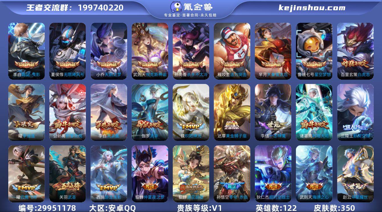 安卓Q-V0-尊贵铂金IV段位-122英雄-350皮肤-8典藏-0珍品无双-0无双-0珍品传说-27传说-116史诗 【英雄全皮】:猪八戒全皮 【荣耀典藏】:武则天英雄,武则天倪克斯神谕,夏侯惇无限飓风号,小乔天鹅之梦,孙尚香杀手不太冷,鲁班七号星空梦想,芈月大秦宣太后,程咬金活力突击,李白鸣剑曳影 【传说皮肤】:艾琳觅芳踪,貂蝉遇见胡旋,赵云淬星耀世,西施游龙清影,曜李逍遥 ,周瑜音你心动,小乔音你心动,兰陵王默契交锋,公孙离祈雪灵祝,诸葛亮时雨天司,镜炽阳神光,虞姬启明星使,孙悟空零号赤焰,关羽武圣,曜云鹰飞将,李信一念神魔,伽罗太华,张良黄金白羊座,虞姬云霓雀翎,达摩黄金狮子座,百里玄策白虎志,梦奇胖达荣荣,貂蝉仲夏夜之梦,李白凤求凰,孙悟空地狱火,武则天海洋之心,狄仁杰超时空战士 【限定皮肤】:白起狰,狄仁杰阴阳师,虞姬凯尔特女王,赵云皇家上将,赵云龙胆,墨子神迹守卫,妲己时之彼端,嬴政白昼王子,鲁班七号狮舞东方,鲁班七号乒乒小将,庄周云端筑梦师,庄周高山流水,阿轲迷踪丽影,孙膑天狼运算者,扁鹊炼金王,白起夜都怪侠,芈月重明,芈月白晶晶,芈月幻夜卜梦,吕布猎兽之王,吕布御风骁将,周瑜赤莲之焰,元歌云间偶戏,夏侯惇朔风刀,甄姬游园惊梦,曹操烛龙,典韦穷奇,典韦蓝屏警告,马可波罗逐梦之星,马可波罗暗影游猎,狄仁杰魔术师,狄仁杰万华元夜,达摩星际陆战队,达摩沙漠行僧,项羽海滩派对,项羽霸王别姬,老夫子醍醐杖,老夫子航海奇遇记,关羽冰锋战神,关羽武圣,貂蝉遇见胡旋,程咬金演武夺筹,刘邦夺宝奇兵,韩信逐梦之影,王昭君凤凰于飞,兰陵王默契交锋,兰陵王驯魔猎人,兰陵王金庭之子,花木兰默契交锋,亚瑟潮玩骑士王,孙悟空大圣娶亲,孙悟空零号赤焰,孙悟空孙行者,牛魔御旌,牛魔奔雷神使,后羿如梦令,后羿圣弓游侠,张飞虎魄,李...