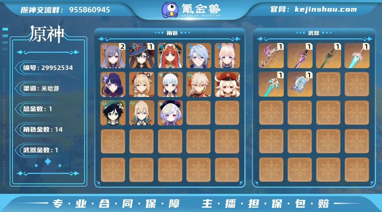 【金色角色】:妮露(0命),神里绫人(0命),珊瑚宫心海(0命),雷电将军(0命),宵宫(0命),神里绫华(0命),枫原万叶(0命),可莉(0命),温迪(0命),琴(0命),刻晴(2命),莫娜(1命),七七(0命) 【拥有武器】:雾切之回光(精1),飞雷之弦振(精1),磐岩结绿(精1),天空之傲(精1),四风原典(精1),天空之刃(精1) 【紫色角色】:绮良良(0命),珐露珊(1命),莱依拉(0命),坎蒂丝(2命),多莉(0命),柯莱(3命),鹿野院平藏(2命),久岐忍(1命),云堇(5命),五郎(0命),托马(4命),九条裟罗(3命),早柚(满命),烟绯(4命),罗莎莉亚(满命),辛焱(2命),迪奥娜(2命),砂糖(0命),雷泽(满命),菲谢尔(2命),丽莎(0命),北斗(1命),香菱(满命),安柏(0命),班尼特(满命),行秋(0命),芭芭拉(4命),凝光(满命),诺艾尔(1命),凯亚(1命)