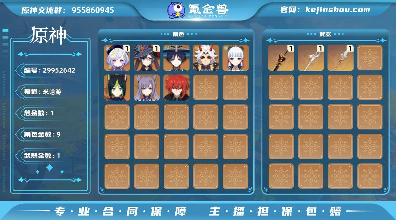 【金色角色】:流浪者(0命),提纳里(0命),荒泷一斗(0命),神里绫华(0命),刻晴(0命),迪卢克(0命),莫娜(1命),七七(1命) 【拥有武器】:赤角石溃杵(精1),风鹰剑(精1),天空之脊(精1) 【紫色角色】:米卡(满命),瑶瑶(1命),珐露珊(4命),莱依拉(0命),多莉(1命),柯莱(1命),云堇(2命),五郎(2命),托马(0命),烟绯(5命),迪奥娜(0命),砂糖(0命),雷泽(0命),丽莎(0命),香菱(0命),安柏(1命),芭芭拉(3命),诺艾尔(1命),凯亚(0命)