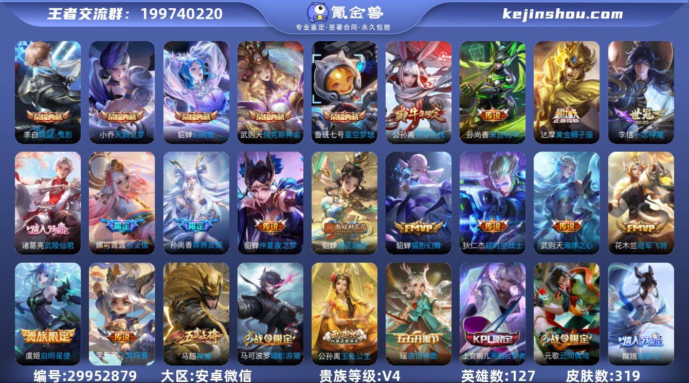 【XY605】贵族9/皮肤328/典藏2/传说31/史诗96/英雄128/孙权全皮/蒙恬全皮/司空震全皮/空空儿全皮/影全皮/天鹅之梦/杀手不太冷/器灵·螭龙剑/离恨烟/碎月剑心/朽木白哉/时之奇旅-孙策/韩信踏浪归/云缨神骥越千峰/云诺千山/愿照·山河定/愿照·九州拓/幻光神枪/鸣野蒿/貂蝉曦玄引/小动物乐团/大乔-时之奇旅/遇见神鼓/灼幽烈阳/百相守梦(张飞)/怒海麟威/诗剑行/绯月行/深海之息/花朝如约/寅虎·瑞焰/淬星耀世/音你心动-小乔/时雨天司/启明星使/一念神魔/黄金白羊座/云霓雀翎/冠军飞将/胖达荣荣/黄金射手座/仲夏夜之梦/地狱之眼/大乔绒语心约/虞姬夏日便利店/阴阳师/皇家上将/优雅恋人/蔷薇恋人/云端筑梦师/高山流水/死亡摇滚/天狼运算者/幻夜卜梦/无心/女儿国国王/山海·玄木吟/魔术师/万华元夜(s22)/沙漠行僧(s26)/海滩派对/醍醐杖(s20)/百相守梦(关羽)/演武夺筹(s23)/金庭之子(s27)/孙行者/云中旅人(s29)/驱傩正仪(s24)/遇见飞天/寅虎·心曲/胡桃夹子/单词大作战/黎明之约/繁星吟游/华丽摇滚/原初探秘者(s21)/五谷丰年/火炮绅士/千军破阵(s25)/原初追遂者/混沌棋(s18)/顽趣-梦奇/大漠名商(s28)/疑决卦(s19)/李小龙/擒涛扼浪(s31)/纤云弄巧/天狼溯光者/梁祝/拒霜思/暖冬·兔眠/至美·乘鲤谣/狂想玩偶喵/探海日志(s32)/海盐诗旅(s30)/星界游侠/流音漫舞/地狱燃心/江河有灵/古海寻踪(s33)/蒙恬荣光圣徽/高渐离燃音魔法/妲己灵卜魔法/鬼谷子天穹祈灯(S34)/龙武盛年/蔬乡物语(鲁班七号)/蔬乡物语(李元芳)/剑破天穹(s35)/刘备异域游侠/熔金海岸/噬灭天穹(s37)/谧流熔炉/荣光之誓/星界战将/九幽镇关/破空之剑/神迹守卫/茶境仙/访茗客/线条小狗-周瑜/石田雨龙/藏狐·褐绒/雪豹·霜爪/龙之律动/器灵·浮梦炉/陌上桑/战舞者/怒海争锋/雪夜绮愿(周瑜)/末日机甲-莱西奥/浮梦罗烟/电玩·爆裂旋风/永昼/暗渊魔法/时之奇旅-安琪拉/乐园奇幻夜/...