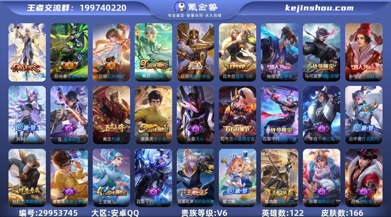 安卓Q-V6-最强王者段位-122英雄-166皮肤-0典藏-0珍品无双-0无双-0珍品传说-6传说-27史诗 【内测皮肤】:艾琳女武神 【传说皮肤】:孙尚香末日机甲,后羿黄金射手座,花木兰冠军飞将,桑启鸣野蒿,云缨幻光神枪,司空震愿照山河定 【限定皮肤】:白起狰,狄仁杰阴阳师,赵云皇家上将,芈月重明,吕布猎兽之王,元歌无心,夏侯惇朔风刀,曹操烛龙,典韦穷奇,马可波罗暗影游猎,狄仁杰魔术师,狄仁杰万华元夜,项羽海滩派对,老夫子醍醐杖,程咬金演武夺筹,孙悟空至尊宝,孙悟空大圣娶亲,牛魔御旌,钟馗驱傩正仪,雅典娜黎明之约,蔡文姬繁星吟游,太乙真人饕餮,鬼谷子原初探秘者,黄忠烈魂,苏烈千军破阵,百里玄策原初追逐者,弈星混沌棋,明世隐疑决卦,裴擒虎李小龙,狂铁御狮,米莱狄御霄,云中君纤云弄巧,盾山御銮,猪八戒西部大镖客,上官婉儿梁祝,艾琳女武神 【年限皮肤】:黄忠烈魂 【赛季限定】:白起狰,芈月重明,夏侯惇朔风刀,曹操烛龙,典韦穷奇,狄仁杰万华元夜,老夫子醍醐杖,程咬金演武夺筹,牛魔御旌,钟馗驱傩正仪,雅典娜黎明之约,太乙真人饕餮,鬼谷子原初探秘者,苏烈千军破阵,百里玄策原初追逐者,弈星混沌棋,明世隐疑决卦,狂铁御狮,米莱狄御霄,盾山御銮 【战令限定】:吕布猎兽之王,马可波罗暗影游猎,猪八戒西部大镖客 【史诗皮肤】:赵云皇家上将,狄仁杰魔术师,妲己魅力维加斯,吕布圣诞狂欢,李白千年之狐,孙悟空至尊宝,花木兰水晶猎龙者,刘邦德古拉伯爵,诸葛亮黄金分割率,百里守约特工魅影,刘禅天才门将,李元芳逐浪之夏,孙策猫狗日记,孙悟空大圣娶亲,狄仁杰鹰眼统帅,上官婉儿梁祝,蔡文姬繁星吟游,黄忠烈魂,马可波罗暗影游猎,百里玄策原初追逐者,裴擒虎李小龙,云中君纤云弄巧,雅典娜黎明之约,元歌无心,百里守约百相守梦,苍狼魂孤将,阿轲化蝶舞 【...