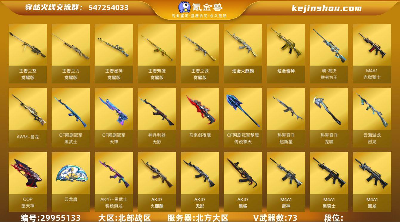 北部战区(北方大区)【生化爆破号】73v【M200-幻神套+皮/黄忠,竞技荣光套装,王者星神,夜魔套装,动感闪耀套装,网剧冠军套装,热带奇洋套装,QBZ03-金色蔷薇+皮/荣耀世冠EP,AWM-裁决+皮/巅峰荣耀,白虎-电玩蓝兔,M4A1-青龙,6烈龙,USP-雷暴,COP-堕天神*3,柯尔特-竞技荣光,破空枪刃-夜魔,Colt1911-大黄蜂,Colt1911-小故障,胡萝卜匕首】5王者【王者星神,王者之城,王者芳薇,王者之力,王者之怒】5炫金【炫金火麒麟,炫金雷神,炫金骑士】12角色【四防电竞教官-云悠悠,四防凌霄,四防王者-春,零·纪元,战地猎狐,奇洋探员,乔伊教练,王者玲珑,王者凌霄,王者樱-热浪之夏,修道士,云海玲珑】6音效【M200-幻神音效卡,AWM-昌龙-怀旧音效卡,屠龙-动感闪耀 音效卡,Barrett-碧霄极光音效卡,Barrett-毁灭音效卡,N9语音包】24皮【幻神-黄忠,QBZ03-荣耀世冠EP,白虎-热带奇洋,黑骑士-摸金校尉,裁决-巅峰荣耀,雷神-宇航兔,毁灭-青帘,火麒麟-雷神,火麒麟-心动糖果,毁灭-神秘黑洞,火麒麟-战神关羽,毁灭-冠军之怒,AWM-天龙-传奇70KG,雷神-荣耀之魄,修罗-冠军之魂,毁灭-英雄计划,火麒麟-AG战队】VIP6截图展示段位不代表实际段位 如赛季更新等不可抗拒因素发生变化、时限道具不保证所剩时间