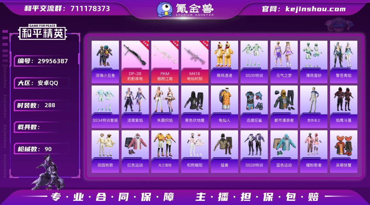 热力值:21800 时装数:288 枪械数:90 战备数:47 游戏等级:54 卓越印记:1 传奇印记:0 绝世印记:0 五级DP-28-豹影疾电,五级M416-电玩时刻,五级PKM-江南烟雨 垂柳戏鸭降落伞 萌鸡速递,SS35特训,元气之梦,薄荷星砂,凌霄紫焰,擎苍青焰,SS34特训套装,朱霞炽焰,Alan Walker,暗影哥特,缤纷果语,长空猛禽,呆萌铁蟹,都市魅力,都市漫游者,粉红小猪,龟仙人,光之冒险,贵族骑装,湖蓝色名流,幻世保卫者,黑色伏地魔,黄色运动,红色运动,幻世战舞者,和煦暖阳,幻羽潜行,橘黑制服,娇憨猪猪,竞技达人朋克,竞技名士,吉莉礼服,街头潮人,空岛之星,蓝彩潮人,蓝调潮人,龙的传人,猎鹰,蓝色运动,龙腾端午,冷焰舞者,猛禽,魅力单车,萌趣咩咩,弄潮海豚,轻风白浪,青玉碎影,人气偶像,深海小丑鱼,帅气教官,SS21特训,SS22特训,SS25特训,SS26特训,SS27特训,SS28特训,甜蜜告白,特训学院,田园牧歌,完美偶像,迅捷狂鲨,绚烂繁星,夏日倾情,耀粉歌者,玉兔迎春,焰鹰斗篷,耀眼新星,灼焰舞者 AKM-霓彩脉冲,Famas-霓彩脉冲,SLR-霓彩脉冲,SVD-霓彩脉冲,破片手榴弹-拽到爆炸,S12K-霓彩脉冲,SCAR-L-彩虹符号,AKM-涂鸦街区,AUG-紫晶流影,AKM-彩虹符号,AKM-破晓战魂,ARX-凌霄紫焰,AUG-天降萌叽,AUG-耀粉歌者,AWM-焰鹰斗篷,DBS-焰鹰斗篷,DP-28-彩虹符号,DP-28-焰鹰斗篷,GROZA-彩虹符号,GROZA-田园牧歌,JS9-凌霄紫焰,Kar98K-红色方程式,Kar98K-王子的夏天,M16A4-幻世战舞者,M249-彩虹符号,M249-糯团青竹,M249-破晓战魂,M416-红色方程式,M416-蓝色火焰,M416-糯团青竹,M762-彩虹符号,M762-奇异狩猎者,MG-36-凌霄紫焰,MG3-暗夜行者,MG3-幻世战舞者,蜜獾-天降萌叽,蜜獾-娇憨猪猪,Mini14-耀粉歌者,Mini14-穿刺龙虾,Mini14-炫彩节奏,Mini14-旋转彩虹,P92-凌霄紫焰,平底锅-娇憨猪猪,平底锅-凌霄紫焰,平底锅-田园牧歌,平底锅-焰鹰斗篷,QBZ-彩虹符号,S12K-幻世战舞者,S12K-娇憨猪猪,S12K-破晓战魂,S12K-夜灯,S1897-炫彩节奏,S686-红色方程式,SCAR-L-红色方程式,SCAR-L-炫彩节奏,SCAR-L-夜灯,SCAR-L-玉兔迎春,SKS-迅猛狂鲨,SLR-娇憨猪猪,沙漠之鹰-旋转彩虹,SPAS-12-田园牧歌,汤姆逊-耀粉歌者,UMP45-蓝色火焰,UMP45-夜灯,UZI-红色方程式,UZI-娇憨猪猪,UZI-天降萌叽,Vector-田园牧歌,Vector-焰鹰斗篷,VSS-田园牧歌,Win94-星兔领航员 SS35王牌降落伞,鸡智如我飞行器,狂鲨锋刃飞行器,娇憨猪猪降落伞,凌霄紫焰降落伞,SS34王牌降落伞,田园牧歌降落伞,焰鹰斗篷降落伞 实名:可二次实名