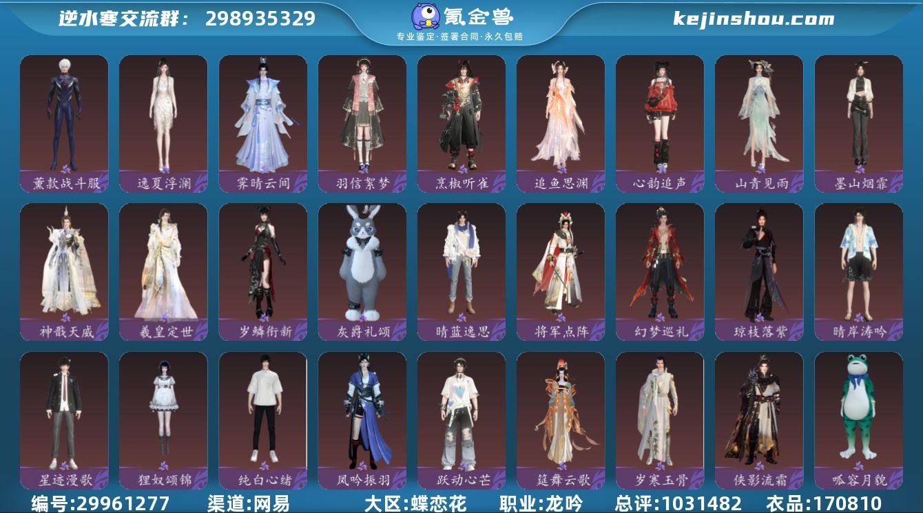 网易支付状态:未注册 换绑冷却:无冷却 职业:龙吟 总评:1031482 衣品:170810 薰款战斗服,逸夏浮澜,霁晴云间,羽信絮梦,烹椒听雀,追鱼思渊,心韵追声,山青见雨,墨山烟霏,神戬天威,羲皇定世,岁鳞衔新,灰爵礼颂,晴蓝逸思,将军点阵,幻梦巡礼,琼枝落紫,晴岸涛吟,星迹漫歌,狸奴颂锦,纯白心绪,凤吟振羽,跃动心芒,筵舞云歌,岁寒玉骨,侠影流霜,呱容月貌,云心儒意,丹枫秋意,玄鹰逐日,四海无拘,风动荷衣,鲤跃今宵,开阳执戈,紫微御宵,兰亭觞咏,帝皇铠甲,逆鳞浊日,金祷颂晖,曦照东晖,瀚渊龙炎,鳞骨逢幽,玄喵夜行,瑞云舒华,鳞纱幻海,金焰追虎,乌夜禁巡,烽火浮生,醉墨狂歌,赤狐魅语,林泽仙踪,白灵幻尘,瀚雪冰封,青瓷映月,燕回南山,御宇临渊,暮云苍野,沧水镜月,春梢剪锦 糖趣解忧,骋风叱焰,贺岁喜狮