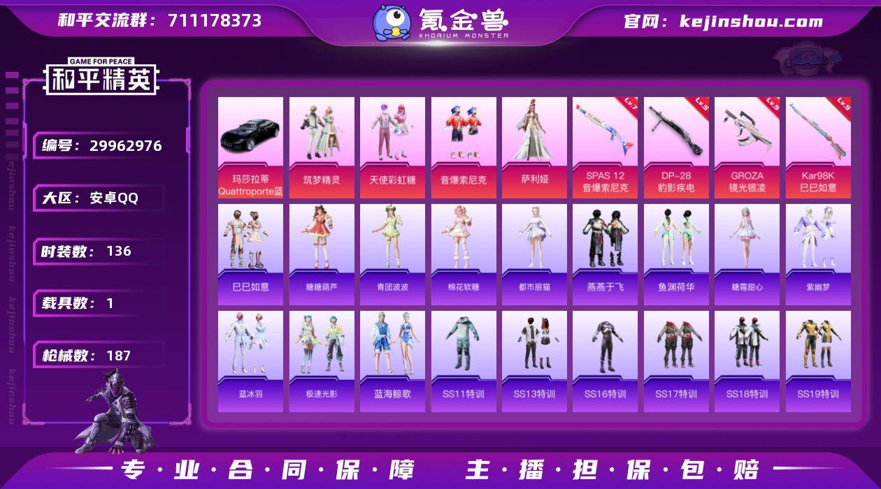 安卓 手Q-4粉装-4特效枪-1载具-1粉色飞行器-56256热力值-2王牌印记-136套装-187枪皮 【热门品类】:粉装-音爆索尼克 【粉色载具】:玛莎拉蒂Quattroporte(夜幕蓝) 【粉色套装】:粉装-天使彩虹糖,粉装-筑梦精灵,粉装-音爆索尼克,角色-萨利娅 【粉色枪皮等级】:GROZA-镜光银凌(五级),Kar98K-巳巳如意(五级),SPAS-12-音爆索尼克(七级),DP-28-豹影疾电(五级) 【粉色枪皮】:GROZA-镜光银凌,Kar98K-巳巳如意,SPAS-12-音爆索尼克,DP-28-豹影疾电 【粉色飞行器】:戏水时光飞行器 【粉色降落伞】:甜心宝贝降落伞,星之彼岸降落伞,洛神天依降落伞,红伞翩翩降落伞,垂柳戏鸭降落伞,纯梦嫁纱降落伞,未来歌姬降落伞,炫光之旅降落伞,精灵梦叶罗丽降落伞,守护天翼降落伞,绯果甜心降落伞 【稀有套装】:套装-巳巳如意,套装-糖糖葫芦,套装-青团波波,套装-棉花软糖,角色-都市丽猫,套装-燕燕于飞,套装-鱼渊荷华,角色-糖霜甜心,套装-紫幽梦,套装-蓝冰羽,套装-极速光影,套装-蓝海鲸歌 【稀有枪皮】:AKM-奇异狩猎者,AKM-彩虹符号,AKM-灼热熔岩,AKM-生命誓言,AKM-破晓战魂,AKM-虎虎生威,AKM-龙的传人,M16A4-幻世战舞者,M16A4-红色方程式,SCAR-L-夜灯,SCAR-L-玉兔迎春,SCAR-L-红色方程式,SCAR-L-黄金龙骨,M416-糯团青竹,M416-红色方程式,M416-蓝色火焰,GROZA-异彩先驱,GROZA-影袭,GROZA-恐龙拽拽,GROZA-懵萌河马,AUG-2P战斗服款,AUG-耀粉歌者,QBZ-彩虹符号,QBZ-未来歌姬,QBZ-洛神天依,QBZ-银碳小老虎,QBZ-飞驰魅影,M762-天降萌叽,M762-牛气冲天,M762-瑞龙福将,M762-甜心宝贝,M762-镭射皇者,M762-风花雪月,Mk47-妙红点点,Mk47-洛神天依,G36C-懵萌河马,G36C-星穹咏叹调,AC-VAL-天降萌叽,AC-VAL-彩虹甜喵,蜜獾-垂柳戏鸭,蜜獾-天降萌叽,蜜獾-娇憨猪猪,UZI-娇憨...