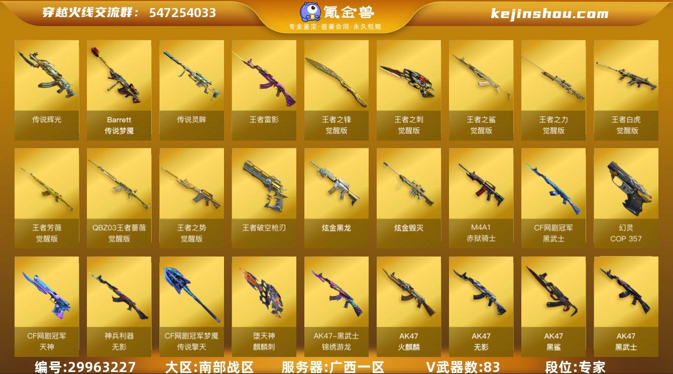 广西一区-87V-14王者-2炫金【双全号 传说梦魇,传说辉光,传说灵眸,QBZ03-金色蔷薇,M14EBR-玄武,HK417-朱雀,M200-幻神,死亡之眼*2,Kar98K-星神,M4A1-黑骑士*5,汤姆逊-烈龙*8,RPK-盘龙*5,加特林-炼狱*2,斯泰尔-蝴蝶,降世魔童,COP 357-幻灵,沙鹰-修罗*3,炽芒蝶刃,金刚伞】 【传说武器】:传说辉光,传说梦魇,传说灵眸 【热门武器】:传说梦魇,传说辉光,传说灵眸,QBZ03-金色蔷薇,M14EBR-玄武,HK417-朱雀,M200-幻神,死亡之眼*2,Kar98K-星神,M4A1-黑骑士*5,汤姆逊-烈龙*8,RPK-盘龙*5,加特林-炼狱*2,斯泰尔-蝴蝶,降世魔童,COP 357-幻灵,沙鹰-修罗*3,炽芒蝶刃,金刚伞 【王者炫金武器】:王者雷影,王者破空枪刃,炫金黑龙,炫金毁灭 【音效卡】:屠龙-云海游龙音效卡,AK47-火麒麟音效卡,M4A1-雷神音效卡,M4A1-黑骑士音效卡,绝迹语音包 【皮肤】:M200-幻神-荣耀世冠白鲨,裁决-流光秘银,星神-璀璨皮肤,雷神-能量核心*3,雷神-耀金皮肤,雷神-源计划2.0专属 皮肤,火麒麟-百城,火麒麟-心动糖果,毁灭-暗月*2,毁灭-星空,毁灭-黑大圣皮肤,黑龙-能量核心*2,黑龙-暗月,无影耀金皮肤*2,死神-秘银,天龙-能量核心,极光-能量核心*2,修罗-能量核心,修罗耀金皮肤,屠龙-春桃 皮肤,龙啸-冠军之啸,龙啸-纸灯龙皮肤 【角色】:葵,樱,魅影,隼,王者春,王者潘多拉,奇洋探员,云海玲珑,飞虎队-X,风暴女*2,嘉年华灵狐,斯沃特-X,兔囡囡,影武者-X 【人偶武器】:天龙-曼陀罗,火麒麟-灵狐,M4A1-雷神-精英刀锋,迷你宝贝,迷你律动酷熊,斯泰尔-蝴蝶,迷你地狱终结者,AWM-灵狐-15周年嘉年华,COP-旗袍,迷你深渊冰龙*2,迷你裂空之翼*3,迷你牛魔王,迷你牛牛,迷你生化手雷,生化手雷-机甲核心,闪光弹-小乔,灵狐娃娃手雷,降世魔童 【暴走生化】:死亡之眼*2 【挑战大...