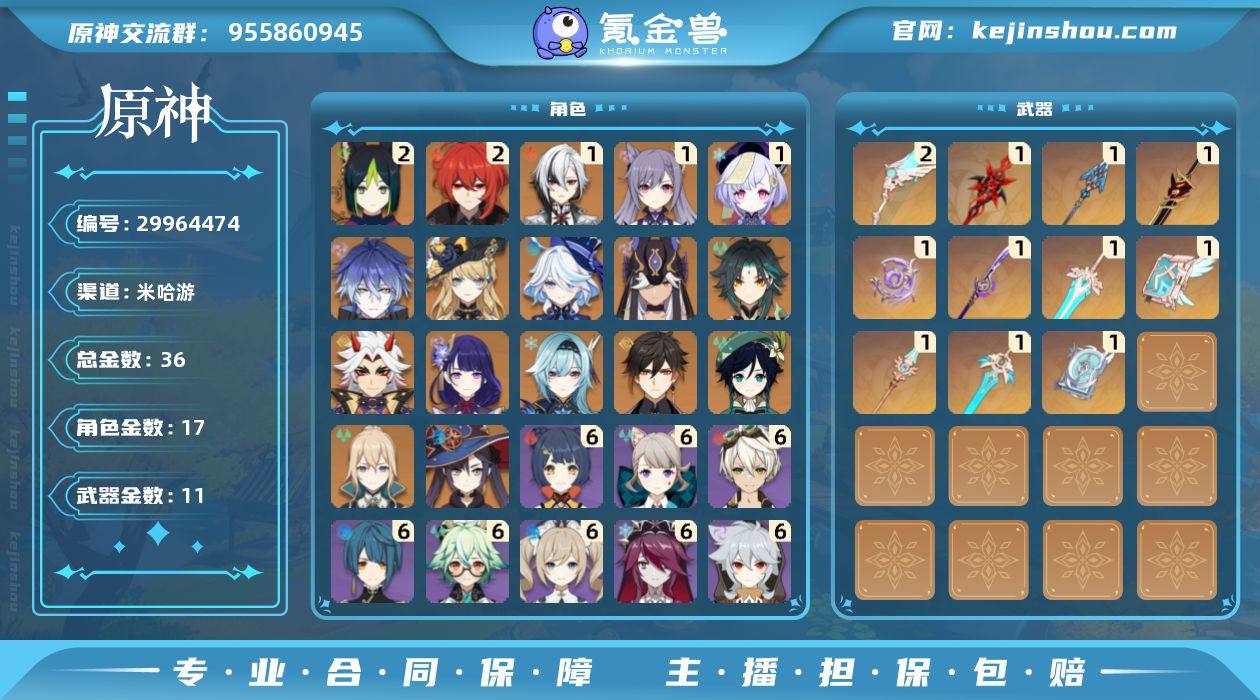 邮箱: 不送邮/死邮 总黄数: 36 冒险等级: 57 2命金色角色: 二命迪卢克,二命提纳里 1命金色角色: 一命七七,一命刻晴,一命阿蕾奇诺 0命金色角色: 温迪,优菈,钟离,莫娜,琴,魈,雷电将军,荒泷一斗,赛诺,芙宁娜,娜维娅,菲林斯 拥有武器: 天空之翼,四风原典,天空之卷,天空之傲,天空之刃,天空之脊,薙草之稻光,不灭月华,息灾,赤角石溃杵,赤月之形 2精武器: 天空之翼 1精武器: 四风原典,天空之卷,天空之傲,天空之刃,天空之脊,薙草之稻光,不灭月华,赤角石溃杵,息灾,赤月之形
