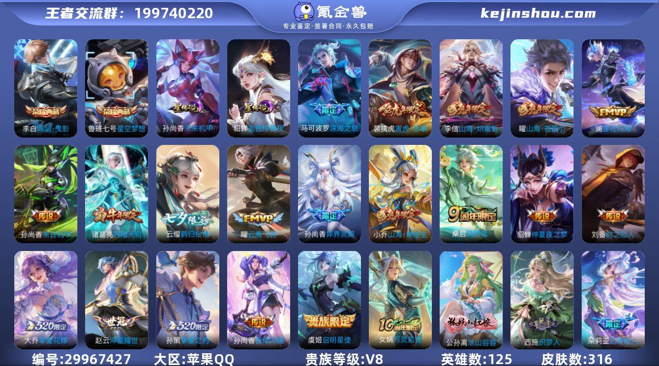 【准v9极品打野带妹号李白鲁班七号典藏20个高质量传说多限定12个个性按键】实名: 可修改 性别: 男号 贵族等级: V8 英雄数: 125 皮肤数: 316 荣耀水晶: 星空梦想,鸣剑·曳影 星传说: 未来机甲,金色仲夏夜 传说皮: 云鹰飞将,末日机甲-孙尚香,仲夏夜之梦,时之恋人-刘备,淬星耀世,挚爱之约,挚爱花嫁,音你闪耀,山海·炽霜斩,山海·琳琅生,山海·苍雷引,鹤归松栖(云缨),澜逐花归海,神树通天 限定皮: 遇见飞天,李小龙,游园惊梦,梁祝,时雨天司,异界灵契,白晶晶,虎魄,天狼运算者,朱雀志,至尊宝,如梦令-后羿,大圣娶亲,霸王别姬-项羽,霸王别姬-虞姬,孙行者,傲雪梅枪,寅虎·赤拳,玉兔公主,深海之息,唐三藏,匿光启智者,时之奇旅-妲己,五谷丰年,梦圆繁星,山海·玄木吟,山海·碧波行,鸣野蒿