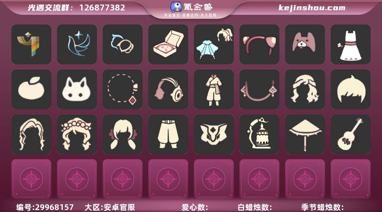 蜡烛数量:400 爱心数量:30 季节蜡烛数量:30 翼数量:100 预言季,梦想季,集结季,潜海季,追忆季 暮土队伍斗篷,霞谷队伍斗篷,雨林队伍斗篷,云野队伍斗篷,二级毕业礼斗篷,紫斗篷,蝴蝶斗篷,紫金斗篷,渔夫斗篷,蟑螂斗,黑金,白金,红金,绿芽,圣诞斗,万圣斗,彩虹斗,樱花斗,粉浴巾 丝滑短发,袍帽发型,荧光珠穗盘发,中分长发,迁徙鳐语者发型,迁徙钟匠发型 紫色护甲裤裙,紫色护甲压褶裤裙,紫色压褶连衣裙,毛绒短裙,水晶礼服,蓝色短裤,武士裤,白棉裤,搓澡巾,毛靴裤 单侧竖纹面具,双纹面具,斜纹面具,织光季横纹面具,织光季裂纹面具,鸦喙面具,受伤面具,老兵胡子面具,呼吸面具,半边面具,裂纹面具,狮子头面具,凤凰面具,鸟嘴胡子面具,白鸟面具,啄人面具,阿努比斯,黄鼠狼,矮人面具,黑脸 迁徙钟匠眼镜,必胜客联动面饰,飘带耳坠,肯德基联动眼镜,青鸟占卜智慧面饰,青鸟毕业面饰 冰晶滑雪板,锦标赛领奖台,雨林队伍旗帜,云野队伍旗帜 圆顶帽 集结季节项链,橙色围脖,风行毛领,圣诞领结 毛靴,凉鞋,芭蕾鞋 小雪人头饰,皮皮猫套装礼包,周年礼包,绊爱,鹿角,蜘蛛斗,牛仔裤,兔子鞋,福娃,鲤鱼套,彩虹帽,雪花球,绒帽,橘子,兔子,雪花,彩虹耳机,创始人,线框斗 卖家说:可小刀,可以换绑手机号,可以换实名,可以绑微信