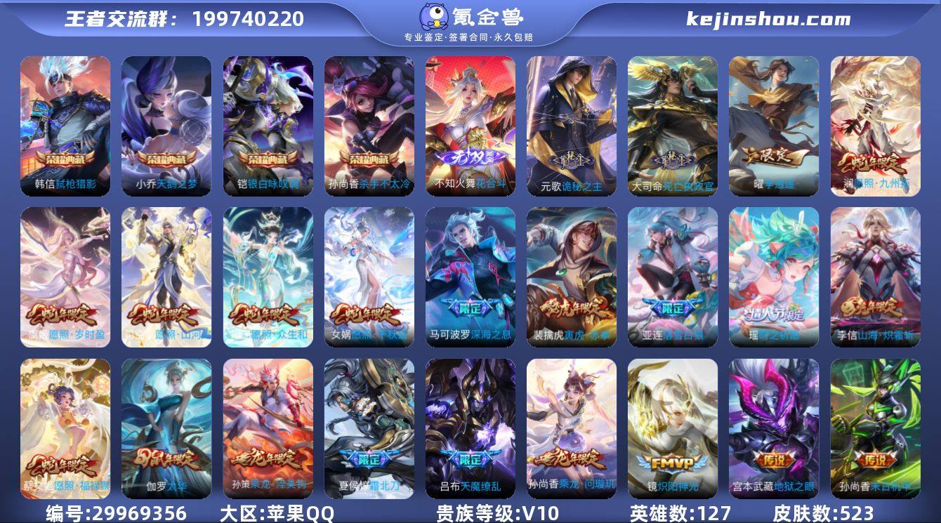 QY1335 由于赛季更新段位以上号为准-苹果Q-英雄数量:127-皮肤数量:523-贵族等级:贵族V10-无双限定1-荣耀典藏4-传说品质87-史诗品质150武则天-花合斗-银白咏叹调-天鹅之梦-杀手不太冷-弑枪猎影-觅芳踪-李逍遥-山海琳琅生-愿照·千秋盛-愿照·福禄聚-愿照·岁时盈-诗剑行-时之祈愿女-乞巧织情-星穹之声-海洋之心-仲夏夜之梦-游龙清影-音你心动女-音你闪耀-花朝如约-猫影幻舞-云霓雀翎-黄金天蝎座-天魔缭乱-太华-诡秘之主-死亡执政官-武陵仙君-一念神魔-时雨天司-深海之息-无双飞将-淬星耀世-玄雷天君-神树通天-寅虎赤拳-零号赤焰-山海炽霜斩-幻光神枪-愿照·山河定-愿照·众生和-云中君群星魔术团-愿照·九州拓-齐天大圣-绯月行-久胜战神-武圣-炽阳神光-末日机甲女-冠军飞将-画中仙-无限倾心女-无限倾心男-炽翼辉光-寅虎瑞焰-异界-营地号:331641730