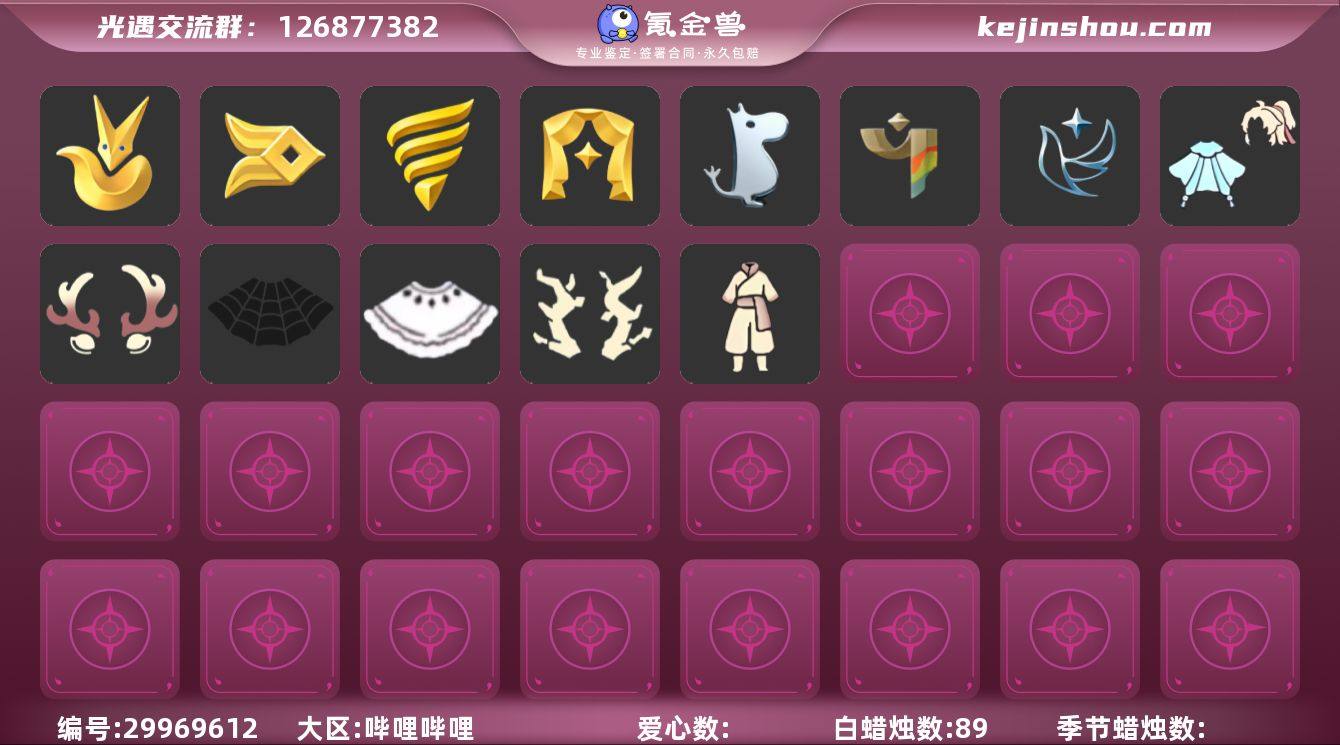 账号类型: 手机账号 季节已毕业: 表演季,破晓季,欧若拉季,夜行季,追忆季,拾光季,归巢季,九色鹿季,筑巢季,二重奏季,青鸟季 完成地图: 晨岛,云野,雨林,霞谷,暮土,禁阁 珍稀物品: 白枭,透明蝶翼斗,彩虹围巾 礼包: 蝙蝠套,巫师,九色鹿角,蜘蛛斗,吉他,橘子,贝壳,兔子,猫背饰,彩虹耳钉,彩虹耳机,蝴蝶结,四叶草,新年耳钉,创始人,小狗周年发饰,青衫落拓礼包,线框斗篷礼包 裤子: 武士裤,背带裤,搓澡巾,蓝绿裤,筑巢季·裤子 面具: 夜行毕业面具,黄眉企鹅面具 面饰: 红耳机,黑框眼镜,青鸟毕业面饰 项链: 围巾 发型: 归巢毕业发型,若笠,虚荣,单侧绑发,留辫蘑菇头,飞天盘发 头饰: 牛仔帽,蓝色音乐会,平顶帽 斗篷: 海洋斗,绿芽,粉红绒毛斗篷,遥鲲斗篷,燕尾斗篷,冥龙斗篷,领主红斗篷,青鸟毕业斗篷 配饰: 雨伞,筑巢季·小手办,高音钢琴,相机,鲲灯 亮点: 【优质装备】:表演季,白枭(帝企鹅发),武士裤,破晓季,透明蝶翼斗,欧若拉季(欧若拉),归巢毕业发型(五塑彩羽发),筑巢季·小手办(光之子试衣),高音钢琴(白色高脚钢琴),夜行季,追忆季,牛仔帽(西部帽),相机(季卡相机),拾光季,彩虹围巾(五塑彩带斗),归巢季,九色鹿(九色鹿季),蓝绿裤(高领舞服),围巾(肩带),筑巢季,二重奏季,筑巢季·裤子(设计师长袍),夜行毕业面具(棕熊面具),黄眉企鹅面具,黑框眼镜(粗框眼镜),单侧绑发(单边小辫),留辫蘑菇头,粉红绒毛斗篷(绒毛斗篷),遥鲲斗篷(双翼遥鲲斗),燕尾斗篷,冥龙斗篷,领主红斗篷(暗红斗篷),鲲灯(追忆之书),飞天盘发(九色鹿丸子头),青鸟季,青鸟毕业面饰(青鸟面饰),青鸟毕业斗篷(青鸟斗篷),蝙蝠套(蝙蝠斗篷)(南瓜头),线框斗篷礼包(周年线框斗篷),红耳机,九色鹿角(神鹿祝福头饰)(神鹿祝福礼包),蜘蛛斗(蛛丝斗篷)(蛛网斗篷),吉他(音韵吉他)(白吉他),巫师(巫师帽),猫背饰(猫咪背饰),彩虹耳机,晨岛,云野,雨林,霞谷,墓土(暮土),禁阁,若笠(箬笠),蝴蝶结(大蝴...